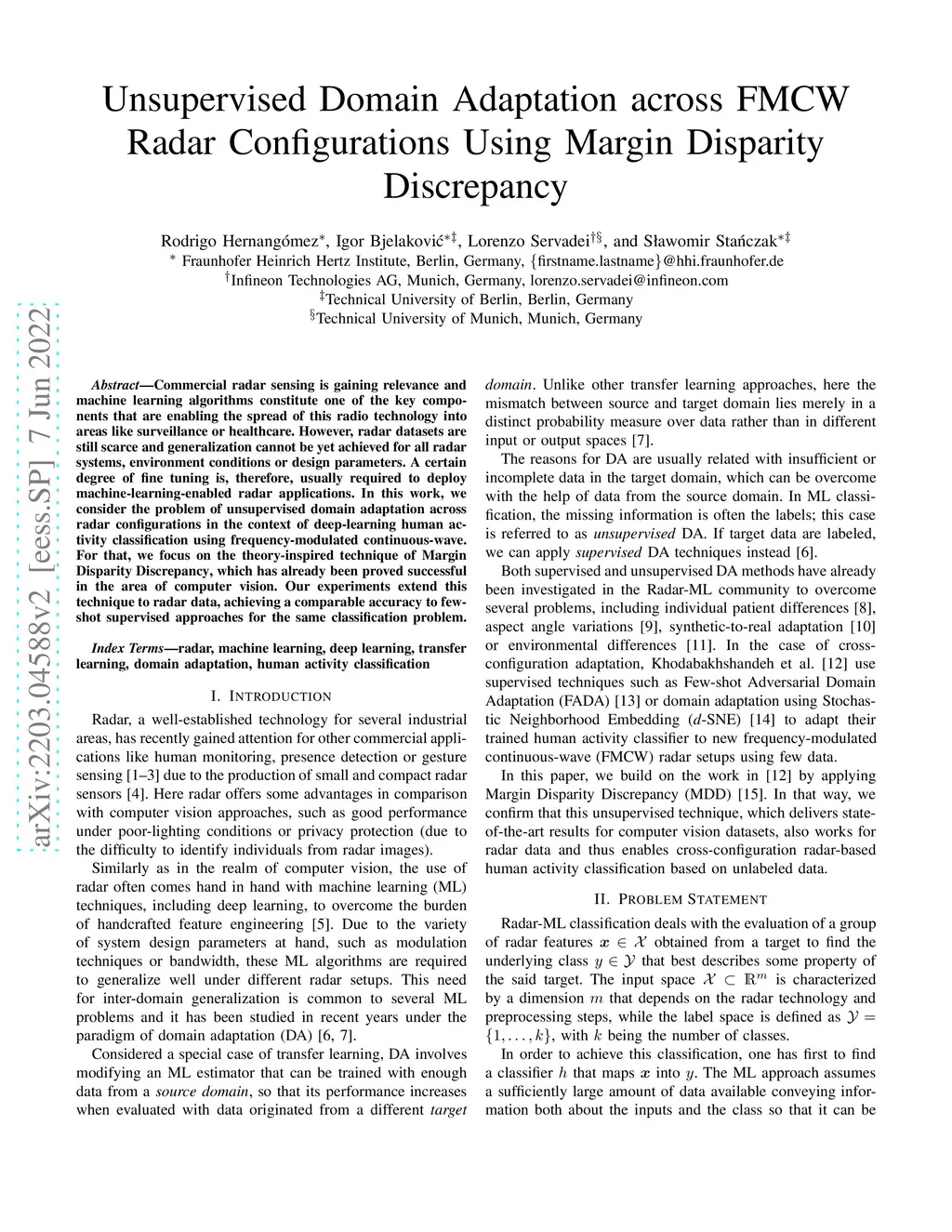 Commercial radar sensing is gaining relevance and machine learning algorithms constitute one of the key components that are enabling the spread of this radio technology into areas like surveillance or healthcare. However, radar datasets are still scarce and generalization cannot be yet achieved for all radar systems, environment conditions or design parameters. A certain degree of fine tuning is, therefore, usually required to deploy machine-learning-enabled radar applications. In this work, we consider the problem of unsupervised domain adaptation across radar configurations in the context of deep-learning human activity classification using frequency-modulated continuous-wave. For that, we focus on the theory-inspired technique of Margin Disparity Discrepancy, which has already been proved successful in the area of computer vision. Our experiments extend this technique to radar data, achieving a comparable accuracy to fewshot supervised approaches for the same classification problem.