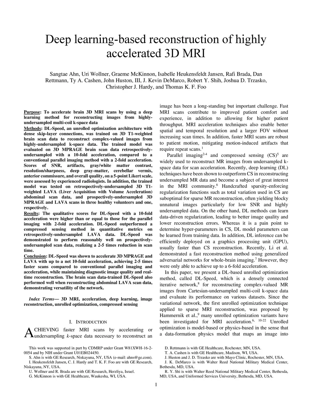 Purpose: To accelerate brain 3D MRI scans by using a deep learning method for reconstructing images from highly-undersampled multi-coil k-space data Methods: DL-Speed, an unrolled optimization architecture with dense skip-layer connections, was trained on 3D T1-weighted brain scan data to reconstruct complex-valued images from highly-undersampled k-space data. The trained model was evaluated on 3D MPRAGE brain scan data retrospectively-undersampled with a 10-fold acceleration, compared to a conventional parallel imaging method with a 2-fold acceleration. Scores of SNR, artifacts, gray/white matter contrast, resolution/sharpness, deep gray-matter, cerebellar vermis, anterior commissure, and overall quality, on a 5-point Likert scale, were assessed by experienced radiologists. In addition, the trained model was tested on retrospectively-undersampled 3D T1-weighted LAVA (Liver Acquisition with Volume Acceleration) abdominal scan data, and prospectively-undersampled 3D MPRAGE and LAVA scans in three healthy volunteers and one, respectively. Results: The qualitative scores for DL-Speed with a 10-fold acceleration were higher than or equal to those for the parallel imaging with 2-fold acceleration. DL-Speed outperformed a compressed sensing method in quantitative metrics on retrospectively-undersampled LAVA data. DL-Speed was demonstrated to perform reasonably well on prospectively-undersampled scan data, realizing a 2-5 times reduction in scan time. Conclusion: DL-Speed was shown to accelerate 3D MPRAGE and LAVA with up to a net 10-fold acceleration, achieving 2-5 times faster scans compared to conventional parallel imaging and acceleration, while maintaining diagnostic image quality and real-time reconstruction. The brain scan data-trained DL-Speed also performed well when reconstructing abdominal LAVA scan data, demonstrating versatility of the network.