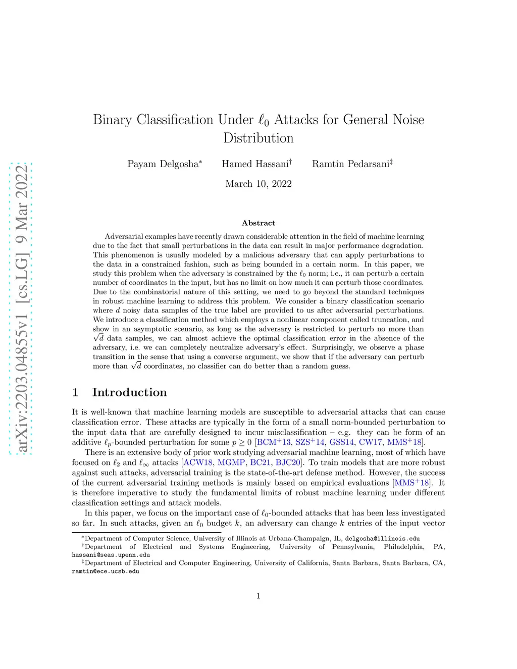 Adversarial examples have recently drawn considerable attention in the field of machine learning due to the fact that small perturbations in the data can result in major performance degradation. This phenomenon is usually modeled by a malicious adversary that can apply perturbations to the data in a constrained fashion, such as being bounded in a certain norm. In this paper, we study this problem when the adversary is constrained by the norm; i.e., it can perturb a certain number of coordinates in the input, but has no limit on how much it can perturb those coordinates. Due to the combinatorial nature of this setting, we need to go beyond the standard techniques in robust machine learning to address this problem. We consider a binary classification scenario where noisy data samples of the true label are provided to us after adversarial perturbations. We introduce a classification method which employs a nonlinear component called truncation, and show in an asymptotic scenario, as long as the adversary is restricted to perturb no more than data samples, we can almost achieve the optimal classification error in the absence of the adversary, i.e. we can completely neutralize adversary's effect. Surprisingly, we observe a phase transition in the sense that using a converse argument, we show that if the adversary can perturb more than coordinates, no classifier can do better than a random guess.