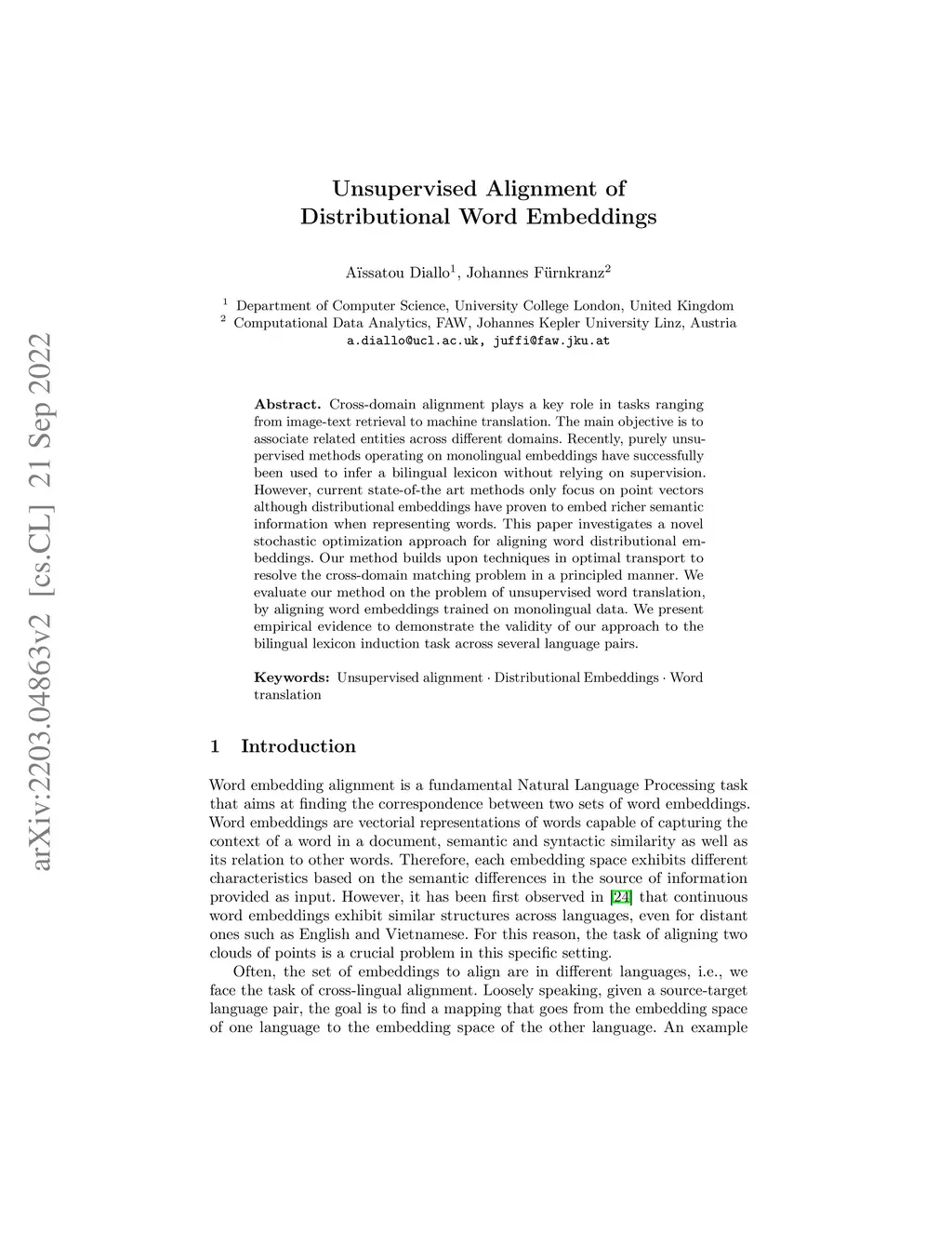Cross-domain alignment play a key roles in tasks ranging from machine translation to transfer learning. Recently, purely unsupervised methods operating on monolingual embeddings have successfully been used to infer a bilingual lexicon without relying on supervision. However, current state-of-the art methods only focus on point vectors although distributional embeddings have proven to embed richer semantic information when representing words. In this paper, we propose stochastic optimization approach for aligning probabilistic embeddings. Finally, we evaluate our method on the problem of unsupervised word translation, by aligning word embeddings trained on monolingual data. We show that the proposed approach achieves good performance on the bilingual lexicon induction task across several language pairs and performs better than the point-vector based approach.