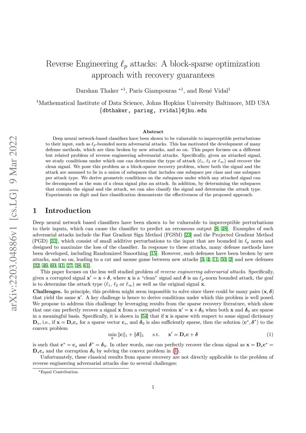 Deep neural network-based classifiers have been shown to be vulnerable to imperceptible perturbations to their input, such as -bounded norm adversarial attacks. This has motivated the development of many defense methods, which are then broken by new attacks, and so on. This paper focuses on a different but related problem of reverse engineering adversarial attacks. Specifically, given an attacked signal, we study conditions under which one can determine the type of attack (, or ) and recover the clean signal. We pose this problem as a block-sparse recovery problem, where both the signal and the attack are assumed to lie in a union of subspaces that includes one subspace per class and one subspace per attack type. We derive geometric conditions on the subspaces under which any attacked signal can be decomposed as the sum of a clean signal plus an attack. In addition, by determining the subspaces that contain the signal and the attack, we can also classify the signal and determine the attack type. Experiments on digit and face classification demonstrate the effectiveness of the proposed approach.