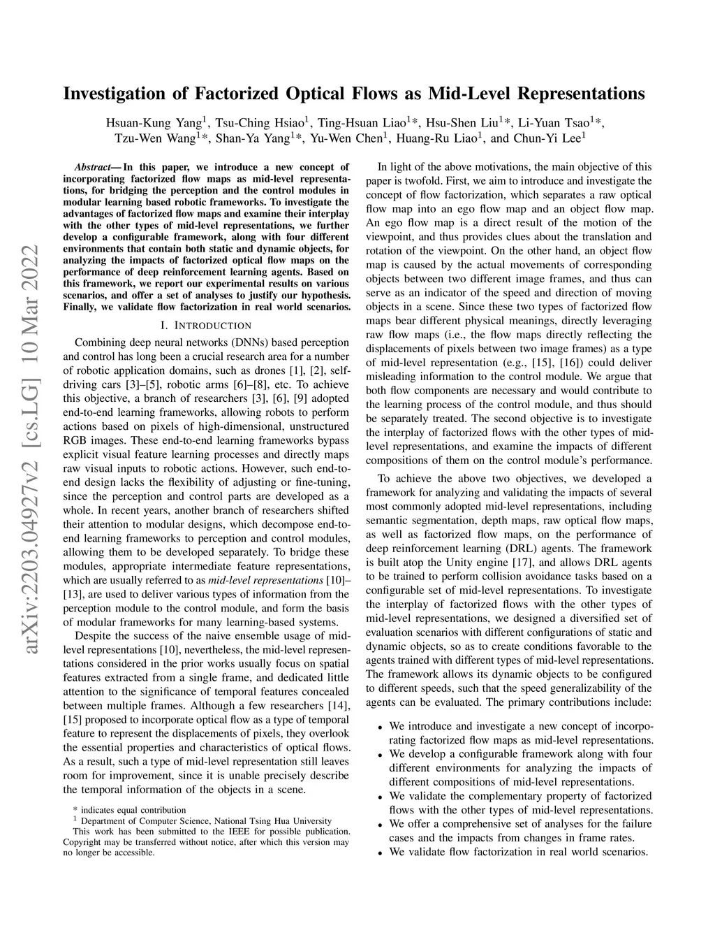 In this paper, we introduce a new concept of incorporating factorized flow maps as mid-level representations, for bridging the perception and the control modules in modular learning based robotic frameworks. To investigate the advantages of factorized flow maps and examine their interplay with the other types of mid-level representations, we further develop a configurable framework, along with four different environments that contain both static and dynamic objects, for analyzing the impacts of factorized optical flow maps on the performance of deep reinforcement learning agents. Based on this framework, we report our experimental results on various scenarios, and offer a set of analyses to justify our hypothesis. Finally, we validate flow factorization in real world scenarios.