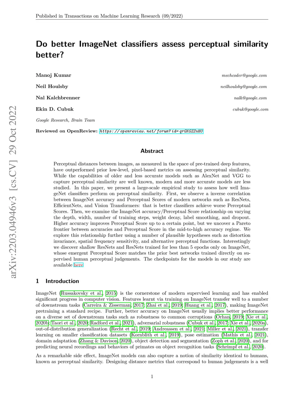 Perceptual distances between images, as measured in the space of pre-trained deep features, have outperformed prior low-level, pixel-based metrics on assessing perceptual similarity. While the capabilities of older and less accurate models such as AlexNet and VGG to capture perceptual similarity are well known, modern and more accurate models are less studied. In this paper, we present a large-scale empirical study to assess how well ImageNet classifiers perform on perceptual similarity. First, we observe a inverse correlation between ImageNet accuracy and Perceptual Scores of modern networks such as ResNets, EfficientNets, and Vision Transformers: that is better classifiers achieve worse Perceptual Scores. Then, we examine the ImageNet accuracy/Perceptual Score relationship on varying the depth, width, number of training steps, weight decay, label smoothing, and dropout. Higher accuracy improves Perceptual Score up to a certain point, but we uncover a Pareto frontier between accuracies and Perceptual Score in the mid-to-high accuracy regime. We explore this relationship further using a number of plausible hypotheses such as distortion invariance, spatial frequency sensitivity, and alternative perceptual functions. Interestingly we discover shallow ResNets and ResNets trained for less than 5 epochs only on ImageNet, whose emergent Perceptual Score matches the prior best networks trained directly on supervised human perceptual judgements. The checkpoints for the models in our study are available at https://console.cloud.google.com/storage/browser/gresearch/perceptual_similarity.