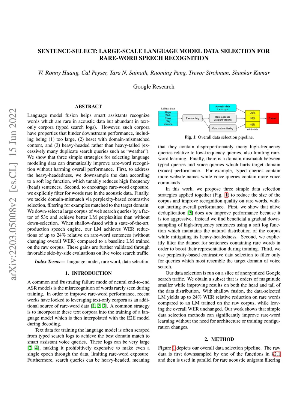 Language model fusion helps smart assistants recognize words which are rare in acoustic data but abundant in text-only corpora (typed search logs). However, such corpora have properties that hinder downstream performance, including being (1) too large, (2) beset with domain-mismatched content, and (3) heavy-headed rather than heavy-tailed (excessively many duplicate search queries such as "weather"). We show that three simple strategies for selecting language modeling data can dramatically improve rare-word recognition without harming overall performance. First, to address the heavy-headedness, we downsample the data according to a soft log function, which tunably reduces high frequency (head) sentences. Second, to encourage rare-word exposure, we explicitly filter for words rare in the acoustic data. Finally, we tackle domain-mismatch via perplexity-based contrastive selection, filtering for examples matched to the target domain. We down-select a large corpus of web search queries by a factor of 53x and achieve better LM perplexities than without down-selection. When shallow-fused with a state-of-the-art, production speech engine, our LM achieves WER reductions of up to 24% relative on rare-word sentences (without changing overall WER) compared to a baseline LM trained on the raw corpus. These gains are further validated through favorable side-by-side evaluations on live voice search traffic.