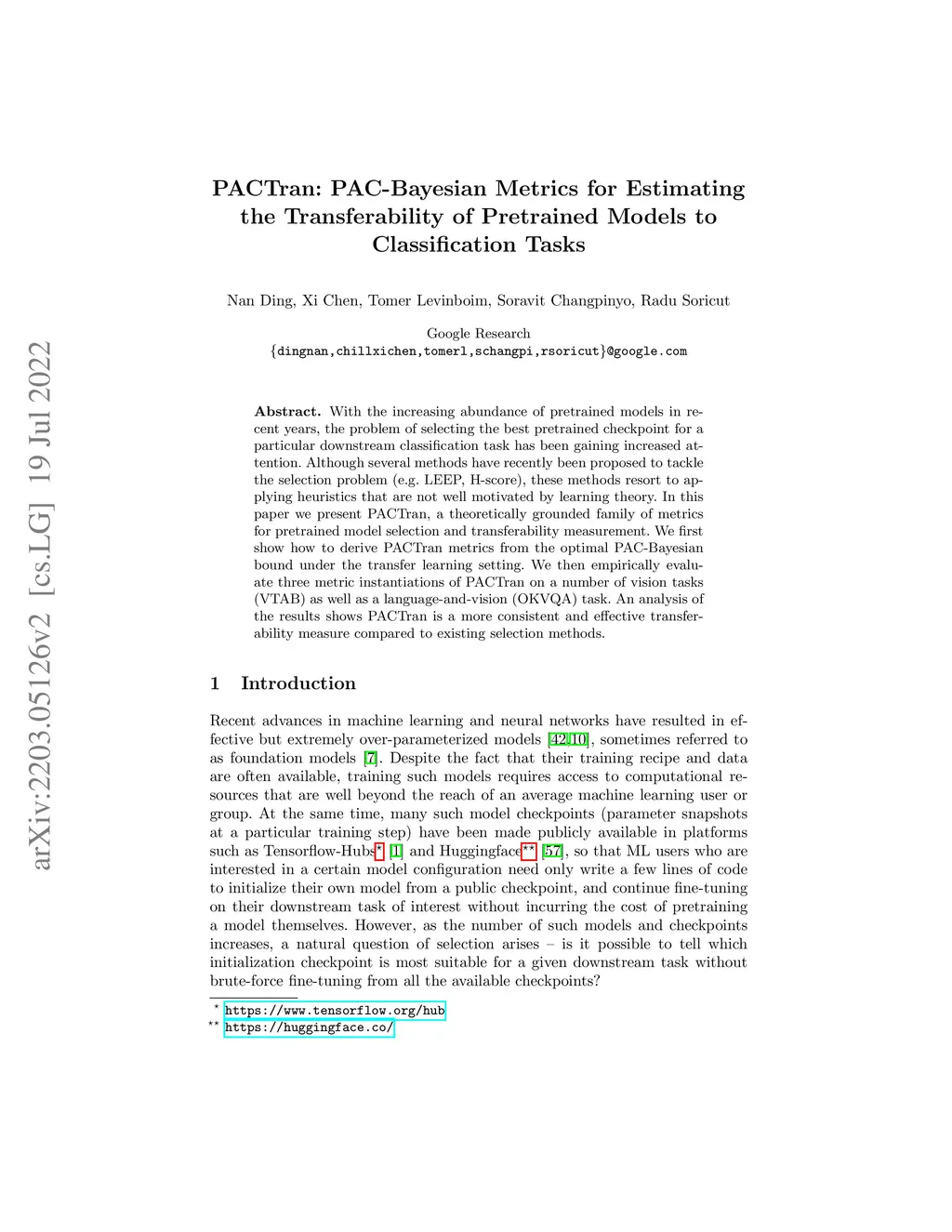 With the increasing abundance of pretrained models in recent years, the problem of selecting the best pretrained checkpoint for a particular downstream classification task has been gaining increased attention. Although several methods have recently been proposed to tackle the selection problem (e.g. LEEP, H-score), these methods resort to applying heuristics that are not well motivated by learning theory. In this paper we present PACTran, a theoretically grounded family of metrics for pretrained model selection and transferability measurement. We first show how to derive PACTran metrics from the optimal PAC-Bayesian bound under the transfer learning setting. We then empirically evaluate three metric instantiations of PACTran on a number of vision tasks (VTAB) as well as a language-and-vision (OKVQA) task. An analysis of the results shows PACTran is a more consistent and effective transferability measure compared to existing selection methods.