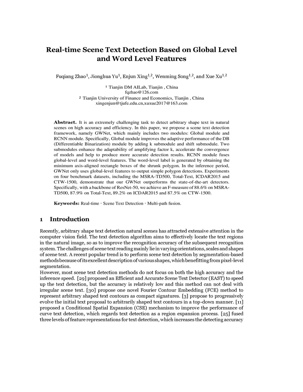 It is an extremely challenging task to detect arbitrary shape text in natural scenes on high accuracy and efficiency. In this paper, we propose a scene text detection framework, namely GWNet, which mainly includes two modules: Global module and RCNN module. Specifically, Global module improves the adaptive performance of the DB (Differentiable Binarization) module by adding k submodule and shift submodule. Two submodules enhance the adaptability of amplifying factor k, accelerate the convergence of models and help to produce more accurate detection results. RCNN module fuses global-level and word-level features. The word-level label is generated by obtaining the minimum axis-aligned rectangle boxes of the shrunk polygon. In the inference period, GWNet only uses global-level features to output simple polygon detections. Experiments on four benchmark datasets, including the MSRA-TD500, Total-Text, ICDAR2015 and CTW-1500, demonstrate that our GWNet outperforms the state-of-the-art detectors. Specifically, with a backbone of ResNet-50, we achieve an F-measure of 88.6% on MSRA- TD500, 87.9% on Total-Text, 89.2% on ICDAR2015 and 87.5% on CTW-1500.