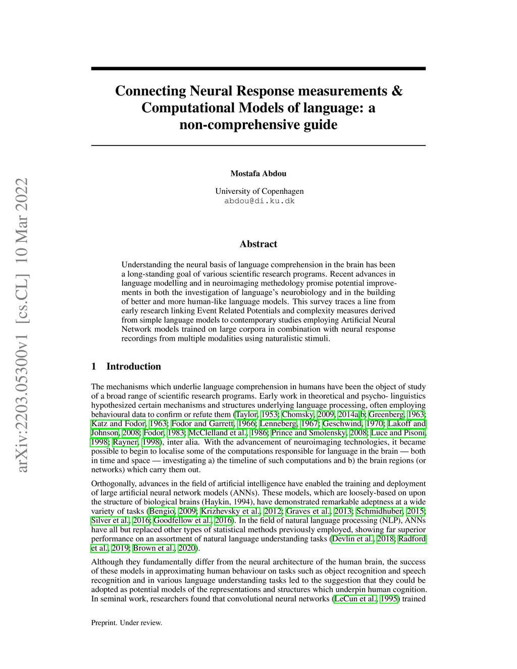 Understanding the neural basis of language comprehension in the brain has been a long-standing goal of various scientific research programs. Recent advances in language modelling and in neuroimaging methodology promise potential improvements in both the investigation of language's neurobiology and in the building of better and more human-like language models. This survey traces a line from early research linking Event Related Potentials and complexity measures derived from simple language models to contemporary studies employing Artificial Neural Network models trained on large corpora in combination with neural response recordings from multiple modalities using naturalistic stimuli.