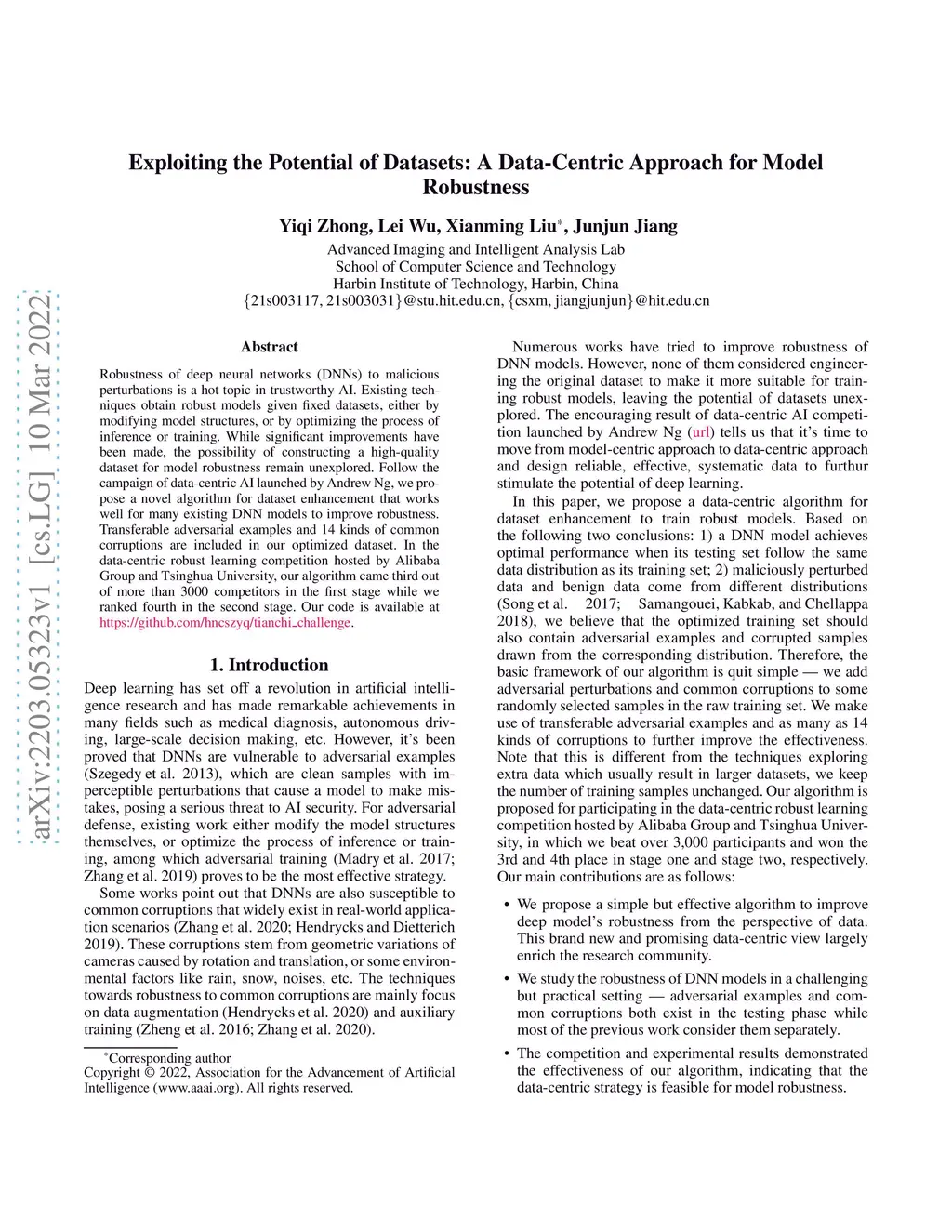 Robustness of deep neural networks (DNNs) to malicious perturbations is a hot topic in trustworthy AI. Existing techniques obtain robust models given fixed datasets, either by modifying model structures, or by optimizing the process of inference or training. While significant improvements have been made, the possibility of constructing a high-quality dataset for model robustness remain unexplored. Follow the campaign of data-centric AI launched by Andrew Ng, we propose a novel algorithm for dataset enhancement that works well for many existing DNN models to improve robustness. Transferable adversarial examples and 14 kinds of common corruptions are included in our optimized dataset. In the data-centric robust learning competition hosted by Alibaba Group and Tsinghua University, our algorithm came third out of more than 3000 competitors in the first stage while we ranked fourth in the second stage. Our code is available at \url{https://github.com/hncszyq/tianchi_challenge}.