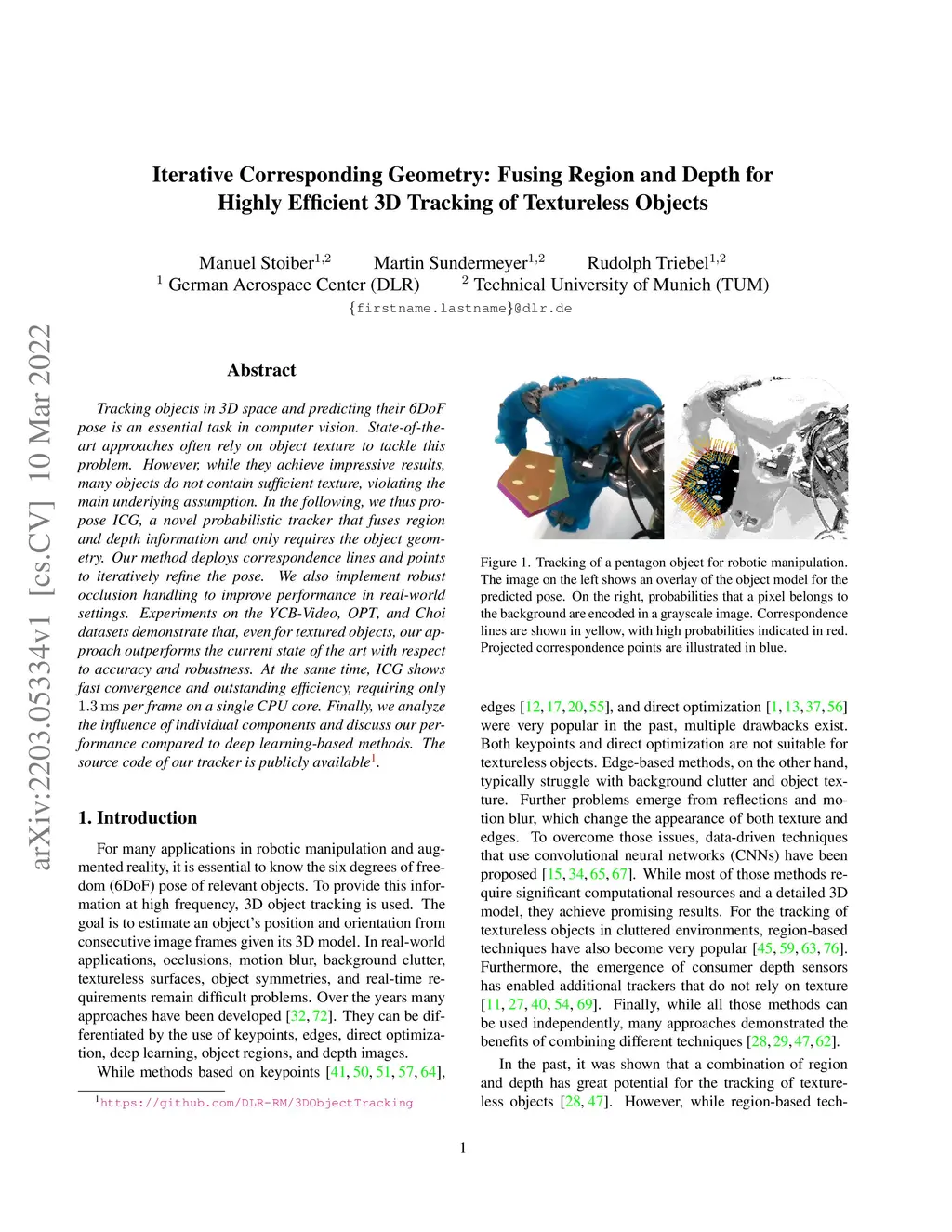 Tracking objects in 3D space and predicting their 6DoF pose is an essential task in computer vision. State-of-the-art approaches often rely on object texture to tackle this problem. However, while they achieve impressive results, many objects do not contain sufficient texture, violating the main underlying assumption. In the following, we thus propose ICG, a novel probabilistic tracker that fuses region and depth information and only requires the object geometry. Our method deploys correspondence lines and points to iteratively refine the pose. We also implement robust occlusion handling to improve performance in real-world settings. Experiments on the YCB-Video, OPT, and Choi datasets demonstrate that, even for textured objects, our approach outperforms the current state of the art with respect to accuracy and robustness. At the same time, ICG shows fast convergence and outstanding efficiency, requiring only 1.3 ms per frame on a single CPU core. Finally, we analyze the influence of individual components and discuss our performance compared to deep learning-based methods. The source code of our tracker is publicly available.
