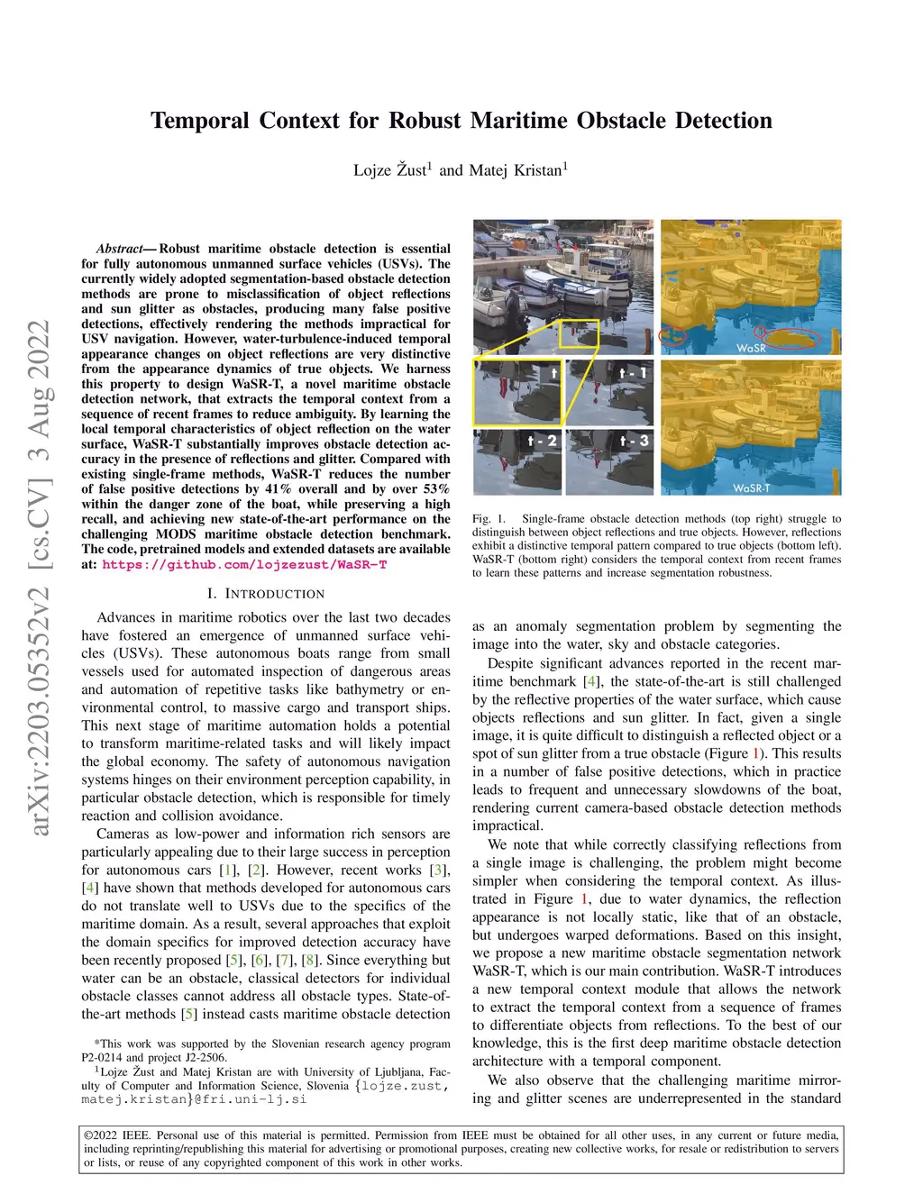 Robust maritime obstacle detection is essential for fully autonomous unmanned surface vehicles (USVs). The currently widely adopted segmentation-based obstacle detection methods are prone to misclassification of object reflections and sun glitter as obstacles, producing many false positive detections, effectively rendering the methods impractical for USV navigation. However, water-turbulence-induced temporal appearance changes on object reflections are very distinctive from the appearance dynamics of true objects. We harness this property to design WaSR-T, a novel maritime obstacle detection network, that extracts the temporal context from a sequence of recent frames to reduce ambiguity. By learning the local temporal characteristics of object reflection on the water surface, WaSR-T substantially improves obstacle detection accuracy in the presence of reflections and glitter. Compared with existing single-frame methods, WaSR-T reduces the number of false positive detections by 41% overall and by over 53% within the danger zone of the boat, while preserving a high recall, and achieving new state-of-the-art performance on the challenging MODS maritime obstacle detection benchmark. The code, pretrained models and extended datasets are available at https://github.com/lojzezust/WaSR-T