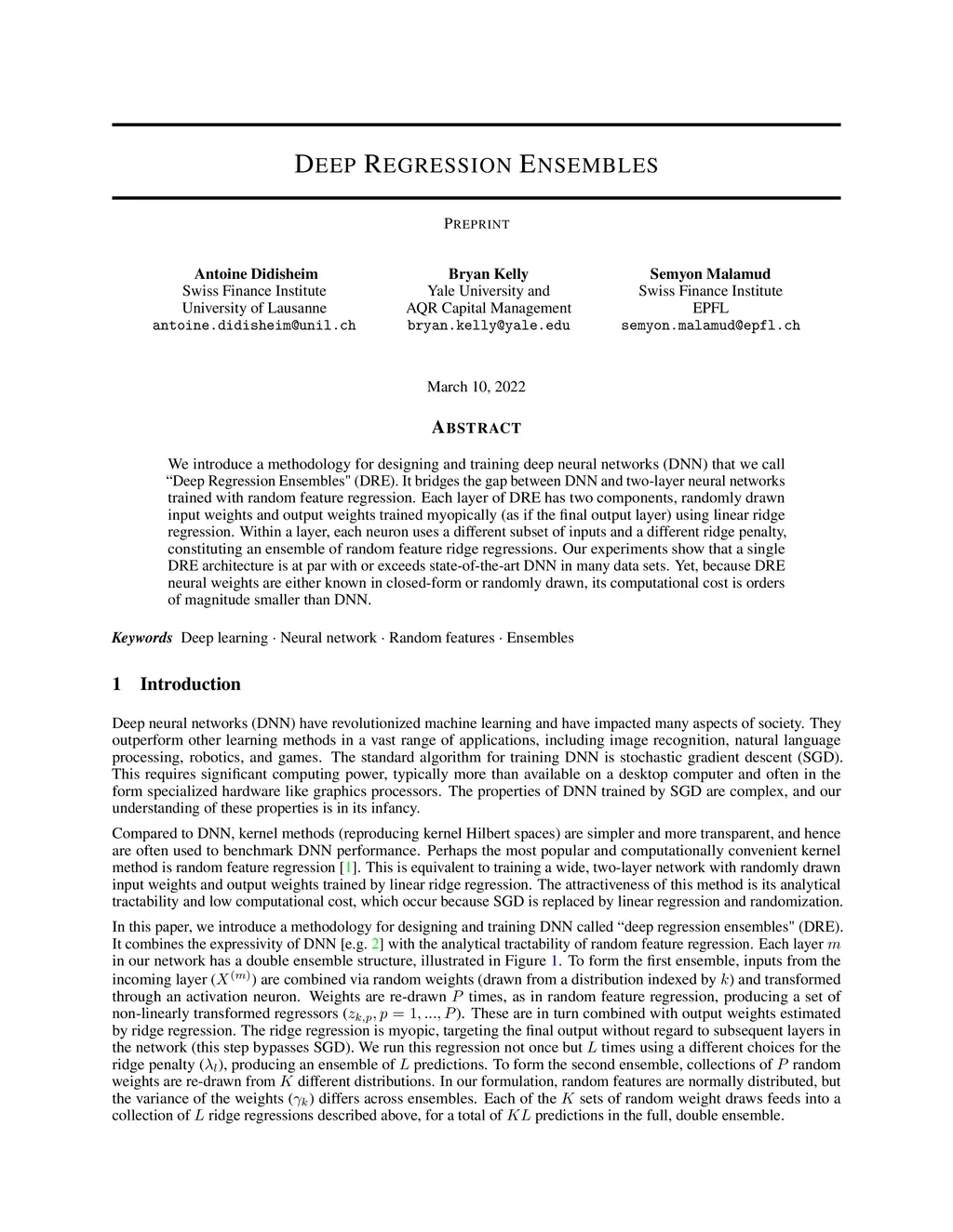 We introduce a methodology for designing and training deep neural networks (DNN) that we call "Deep Regression Ensembles" (DRE). It bridges the gap between DNN and two-layer neural networks trained with random feature regression. Each layer of DRE has two components, randomly drawn input weights and output weights trained myopically (as if the final output layer) using linear ridge regression. Within a layer, each neuron uses a different subset of inputs and a different ridge penalty, constituting an ensemble of random feature ridge regressions. Our experiments show that a single DRE architecture is at par with or exceeds state-of-the-art DNN in many data sets. Yet, because DRE neural weights are either known in closed-form or randomly drawn, its computational cost is orders of magnitude smaller than DNN.