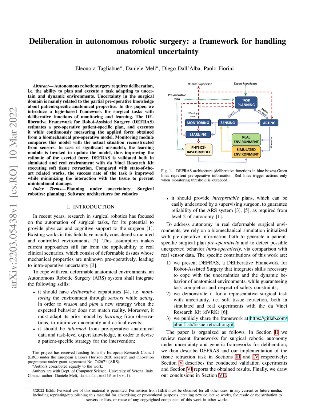 Autonomous robotic surgery requires deliberation, i.e. the ability to plan and execute a task adapting to uncertain and dynamic environments. Uncertainty in the surgical domain is mainly related to the partial pre-operative knowledge about patient-specific anatomical properties. In this paper, we introduce a logic-based framework for surgical tasks with deliberative functions of monitoring and learning. The DEliberative Framework for Robot-Assisted Surgery (DEFRAS) estimates a pre-operative patient-specific plan, and executes it while continuously measuring the applied force obtained from a biomechanical pre-operative model. Monitoring module compares this model with the actual situation reconstructed from sensors. In case of significant mismatch, the learning module is invoked to update the model, thus improving the estimate of the exerted force. DEFRAS is validated both in simulated and real environment with da Vinci Research Kit executing soft tissue retraction. Compared with state-of-the art related works, the success rate of the task is improved while minimizing the interaction with the tissue to prevent unintentional damage.