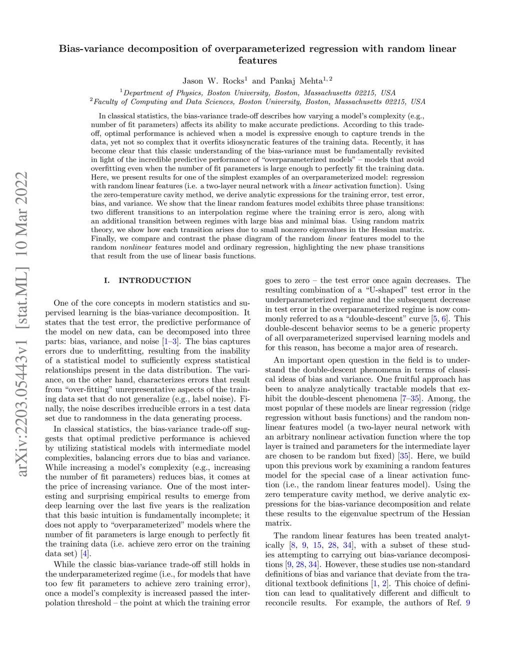 In classical statistics, the bias-variance trade-off describes how varying a model's complexity (e.g., number of fit parameters) affects its ability to make accurate predictions. According to this trade-off, optimal performance is achieved when a model is expressive enough to capture trends in the data, yet not so complex that it overfits idiosyncratic features of the training data. Recently, it has become clear that this classic understanding of the bias-variance must be fundamentally revisited in light of the incredible predictive performance of "overparameterized models" -- models that avoid overfitting even when the number of fit parameters is large enough to perfectly fit the training data. Here, we present results for one of the simplest examples of an overparameterized model: regression with random linear features (i.e. a two-layer neural network with a linear activation function). Using the zero-temperature cavity method, we derive analytic expressions for the training error, test error, bias, and variance. We show that the linear random features model exhibits three phase transitions: two different transitions to an interpolation regime where the training error is zero, along with an additional transition between regimes with large bias and minimal bias. Using random matrix theory, we show how each transition arises due to small nonzero eigenvalues in the Hessian matrix. Finally, we compare and contrast the phase diagram of the random linear features model to the random nonlinear features model and ordinary regression, highlighting the new phase transitions that result from the use of linear basis functions.