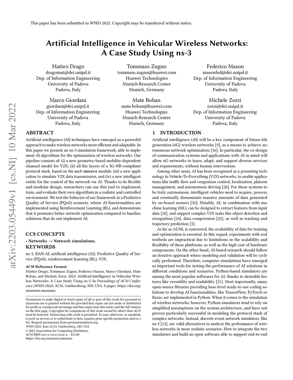 Artificial intelligence (AI) techniques have emerged as a powerful approach to make wireless networks more efficient and adaptable. In this paper we present an ns-3 simulation framework, able to implement AI algorithms for the optimization of wireless networks. Our pipeline consists of: (i) a new geometry-based mobility-dependent channel model for V2X; (ii) all the layers of a 5G-NR-compliant protocol stack, based on the ns3-mmwave module; (iii) a new application to simulate V2X data transmission, and (iv) a new intelligent entity for the control of the network via AI. Thanks to its flexible and modular design, researchers can use this tool to implement, train, and evaluate their own algorithms in a realistic and controlled environment. We test the behavior of our framework in a Predictive Quality of Service (PQoS) scenario, where AI functionalities are implemented using Reinforcement Learning (RL), and demonstrate that it promotes better network optimization compared to baseline solutions that do not implement AI.