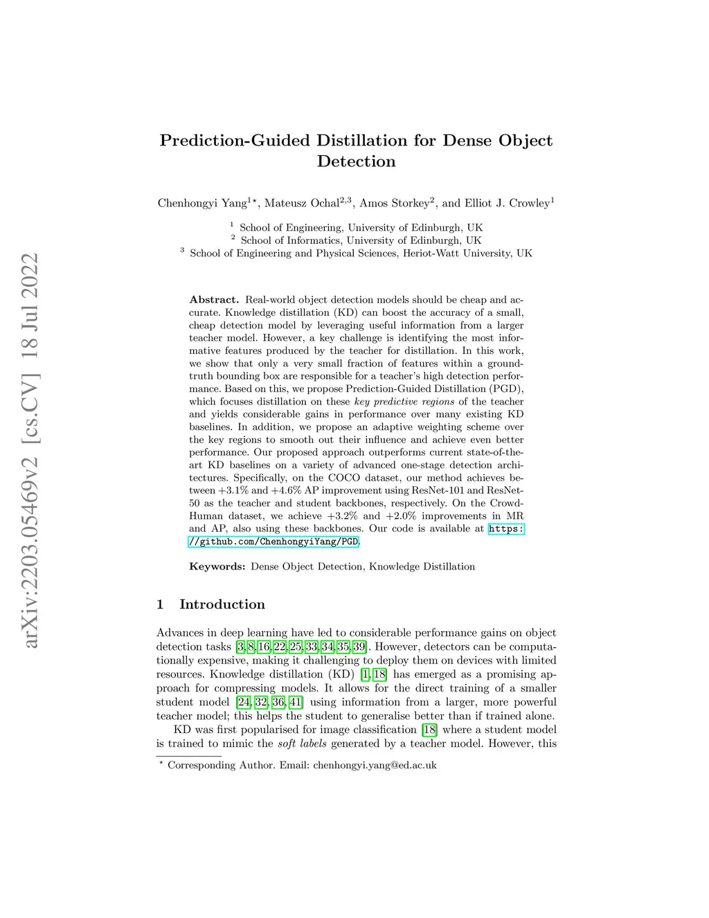 Real-world object detection models should be cheap and accurate. Knowledge distillation (KD) can boost the accuracy of a small, cheap detection model by leveraging useful information from a larger teacher model. However, a key challenge is identifying the most informative features produced by the teacher for distillation. In this work, we show that only a very small fraction of features within a ground-truth bounding box are responsible for a teacher's high detection performance. Based on this, we propose Prediction-Guided Distillation (PGD), which focuses distillation on these key predictive regions of the teacher and yields considerable gains in performance over many existing KD baselines. In addition, we propose an adaptive weighting scheme over the key regions to smooth out their influence and achieve even better performance. Our proposed approach outperforms current state-of-the-art KD baselines on a variety of advanced one-stage detection architectures. Specifically, on the COCO dataset, our method achieves between +3.1% and +4.6% AP improvement using ResNet-101 and ResNet-50 as the teacher and student backbones, respectively. On the CrowdHuman dataset, we achieve +3.2% and +2.0% improvements in MR and AP, also using these backbones. Our code is available at https://github.com/ChenhongyiYang/PGD.