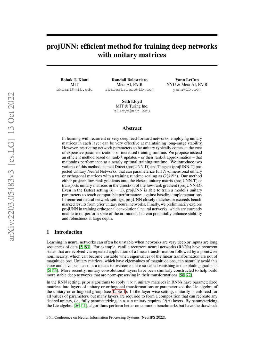 projUNN: efficient method for training deep networks with unitary