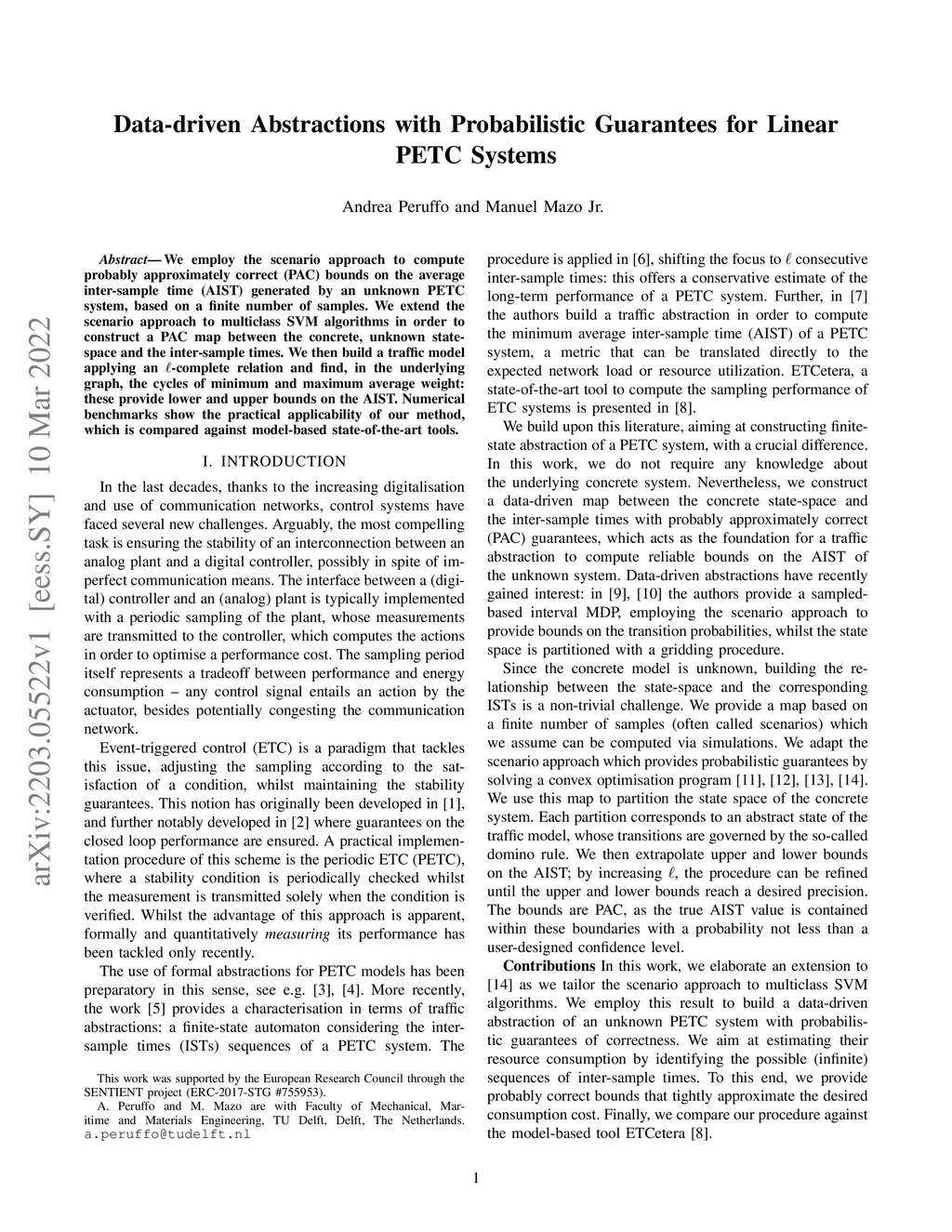 We employ the scenario approach to compute probably approximately correct (PAC) bounds on the average inter-sample time (AIST) generated by an unknown PETC system, based on a finite number of samples. We extend the scenario approach to multiclass SVM algorithms in order to construct a PAC map between the concrete, unknown state-space and the inter-sample times. We then build a traffic model applying an -complete relation and find, in the underlying graph, the cycles of minimum and maximum average weight: these provide lower and upper bounds on the AIST. Numerical benchmarks show the practical applicability of our method, which is compared against model-based state-of-the-art tools.