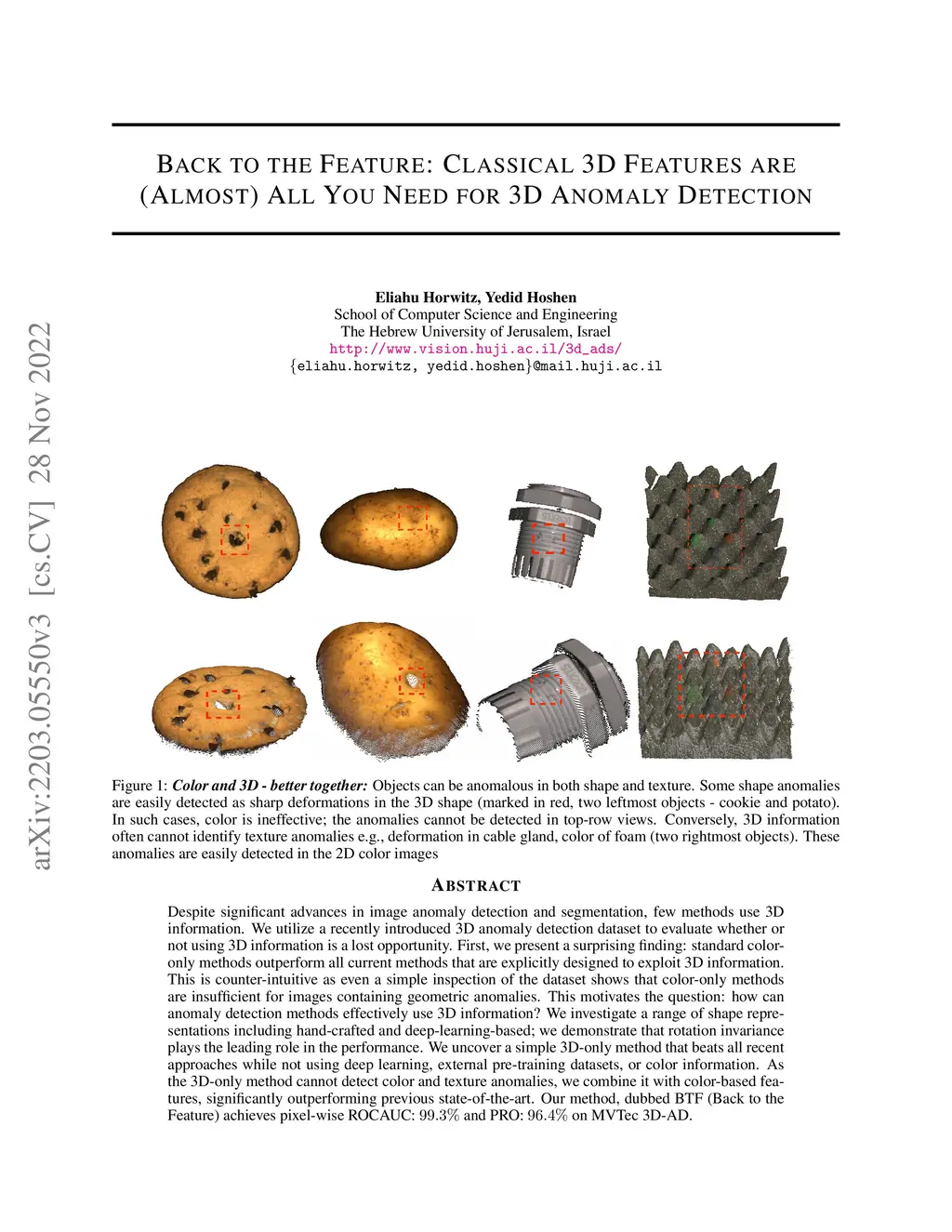 Despite significant advances in image anomaly detection and segmentation, few methods use 3D information. We utilize a recently introduced 3D anomaly detection dataset to evaluate whether or not using 3D information is a lost opportunity. First, we present a surprising finding: standard color-only methods outperform all current methods that are explicitly designed to exploit 3D information. This is counter-intuitive as even a simple inspection of the dataset shows that color-only methods are insufficient for images containing geometric anomalies. This motivates the question: how can anomaly detection methods effectively use 3D information? We investigate a range of shape representations including hand-crafted and deep-learning-based; we demonstrate that rotation invariance plays the leading role in the performance. We uncover a simple 3D-only method that beats all recent approaches while not using deep learning, external pre-training datasets, or color information. As the 3D-only method cannot detect color and texture anomalies, we combine it with color-based features, significantly outperforming previous state-of-the-art. Our method, dubbed BTF (Back to the Feature) achieves pixel-wise ROCAUC: 99.3% and PRO: 96.4% on MVTec 3D-AD.
