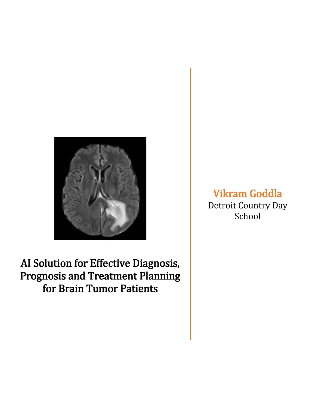 Glioblastomas are the most common malignant brain tumors in adults. Approximately 200000 people die each year from Glioblastoma in the world. Glioblastoma patients have a median survival of 12 months with optimal therapy and about 4 months without treatment. Glioblastomas appear as heterogeneous necrotic masses with irregular peripheral enhancement, surrounded by vasogenic edema. The current standard of care includes surgical resection, radiotherapy and chemotherapy, which require accurate segmentation of brain tumor subregions. For effective treatment planning, it is vital to identify the methylation status of the promoter of Methylguanine Methyltransferase (MGMT), a positive prognostic factor for chemotherapy. However, current methods for brain tumor segmentation are tedious, subjective and not scalable, and current techniques to determine the methylation status of MGMT promoter involve surgically invasive procedures, which are expensive and time consuming. Hence there is a pressing need to develop automated tools to segment brain tumors and non-invasive methods to predict methylation status of MGMT promoter, to facilitate better treatment planning and improve survival rate. I created an integrated diagnostics solution powered by Artificial Intelligence to automatically segment brain tumor subregions and predict MGMT promoter methylation status, using brain MRI scans. My AI solution is proven on large datasets with performance exceeding current standards and field tested with data from teaching files of local neuroradiologists. With my solution, physicians can submit brain MRI images, and get segmentation and methylation predictions in minutes, and guide brain tumor patients with effective treatment planning and ultimately improve survival time.