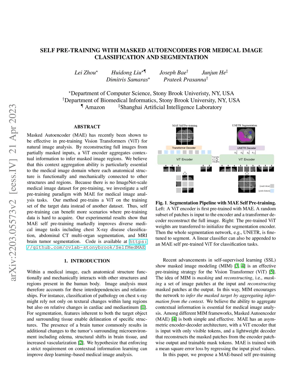 Masked Autoencoder (MAE) has recently been shown to be effective in pre-training Vision Transformers (ViT) for natural image analysis. By reconstructing full images from partially masked inputs, a ViT encoder aggregates contextual information to infer masked image regions. We believe that this context aggregation ability is particularly essential to the medical image domain where each anatomical structure is functionally and mechanically connected to other structures and regions. Because there is no ImageNet-scale medical image dataset for pre-training, we investigate a self pre-training paradigm with MAE for medical image analysis tasks. Our method pre-trains a ViT on the training set of the target data instead of another dataset. Thus, self pre-training can benefit more scenarios where pre-training data is hard to acquire. Our experimental results show that MAE self pre-training markedly improves diverse medical image tasks including chest X-ray disease classification, abdominal CT multi-organ segmentation, and MRI brain tumor segmentation. Code is available at https://github.com/cvlab-stonybrook/SelfMedMAE