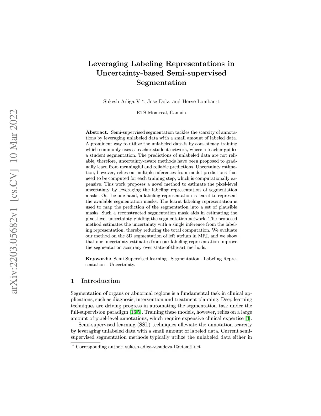 Semi-supervised segmentation tackles the scarcity of annotations by leveraging unlabeled data with a small amount of labeled data. A prominent way to utilize the unlabeled data is by consistency training which commonly uses a teacher-student network, where a teacher guides a student segmentation. The predictions of unlabeled data are not reliable, therefore, uncertainty-aware methods have been proposed to gradually learn from meaningful and reliable predictions. Uncertainty estimation, however, relies on multiple inferences from model predictions that need to be computed for each training step, which is computationally expensive. This work proposes a novel method to estimate the pixel-level uncertainty by leveraging the labeling representation of segmentation masks. On the one hand, a labeling representation is learnt to represent the available segmentation masks. The learnt labeling representation is used to map the prediction of the segmentation into a set of plausible masks. Such a reconstructed segmentation mask aids in estimating the pixel-level uncertainty guiding the segmentation network. The proposed method estimates the uncertainty with a single inference from the labeling representation, thereby reducing the total computation. We evaluate our method on the 3D segmentation of left atrium in MRI, and we show that our uncertainty estimates from our labeling representation improve the segmentation accuracy over state-of-the-art methods.