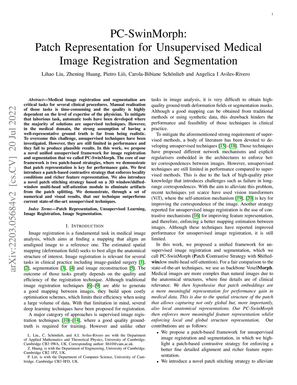 PC-SwinMorph: Patch Representation for Unsupervised Medical Image Registration and Segmentation