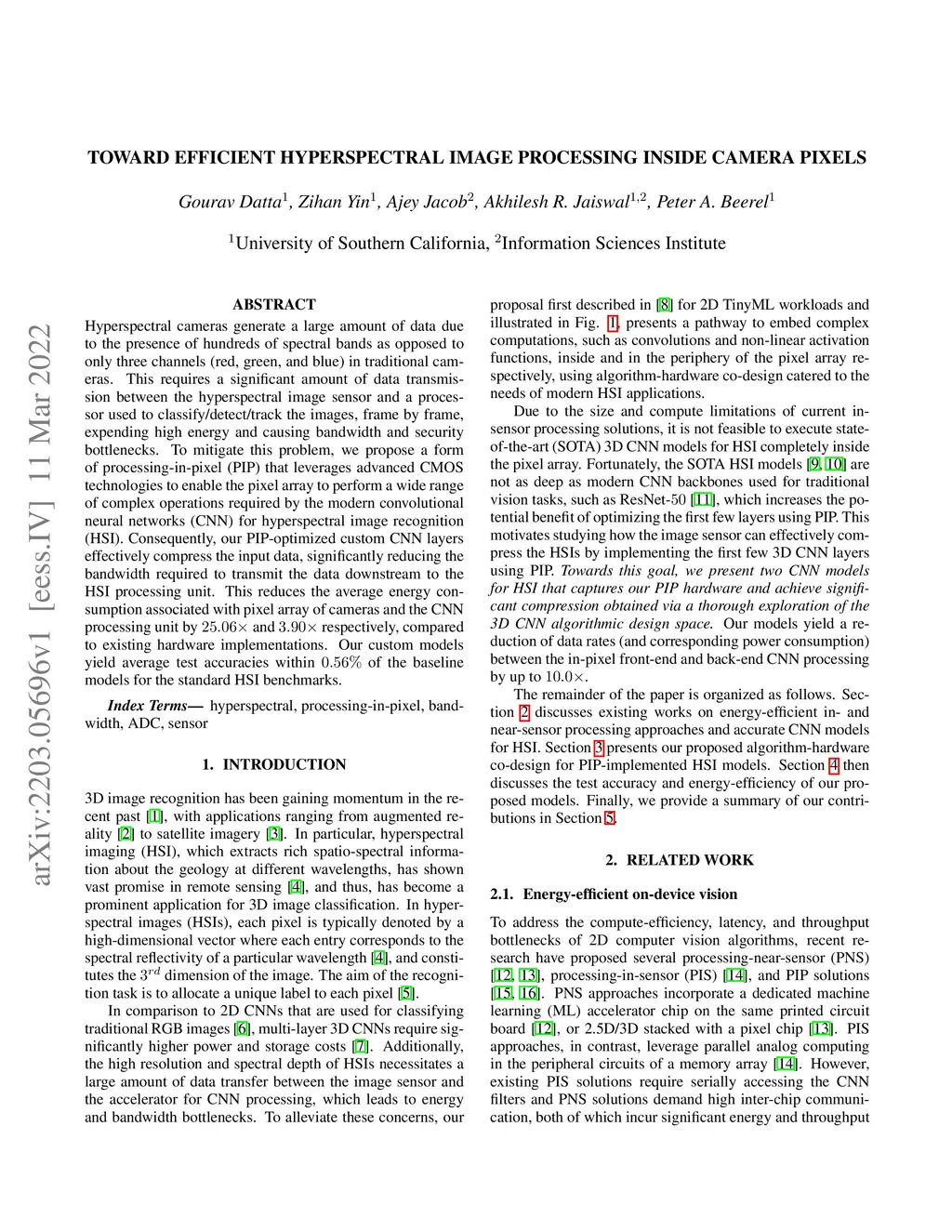 Hyperspectral cameras generate a large amount of data due to the presence of hundreds of spectral bands as opposed to only three channels (red, green, and blue) in traditional cameras. This requires a significant amount of data transmission between the hyperspectral image sensor and a processor used to classify/detect/track the images, frame by frame, expending high energy and causing bandwidth and security bottlenecks. To mitigate this problem, we propose a form of processing-in-pixel (PIP) that leverages advanced CMOS technologies to enable the pixel array to perform a wide range of complex operations required by the modern convolutional neural networks (CNN) for hyperspectral image recognition (HSI). Consequently, our PIP-optimized custom CNN layers effectively compress the input data, significantly reducing the bandwidth required to transmit the data downstream to the HSI processing unit. This reduces the average energy consumption associated with pixel array of cameras and the CNN processing unit by 25.06x and 3.90x respectively, compared to existing hardware implementations. Our custom models yield average test accuracies within 0.56% of the baseline models for the standard HSI benchmarks.