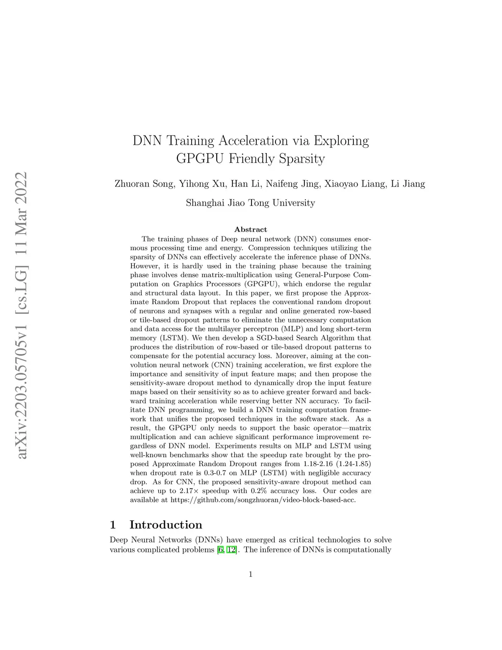 The training phases of Deep neural network~(DNN) consumes enormous processing time and energy. Compression techniques utilizing the sparsity of DNNs can effectively accelerate the inference phase of DNNs. However, it is hardly used in the training phase because the training phase involves dense matrix-multiplication using General-Purpose Computation on Graphics Processors (GPGPU), which endorse the regular and structural data layout. In this paper, we first propose the Approximate Random Dropout that replaces the conventional random dropout of neurons and synapses with a regular and online generated row-based or tile-based dropout patterns to eliminate the unnecessary computation and data access for the multilayer perceptron~(MLP) and long short-term memory~(LSTM). We then develop a SGD-based Search Algorithm that produces the distribution of row-based or tile-based dropout patterns to compensate for the potential accuracy loss. Moreover, aiming at the convolution neural network~(CNN) training acceleration, we first explore the importance and sensitivity of input feature maps; and then propose the sensitivity-aware dropout method to dynamically drop the input feature maps based on their sensitivity so as to achieve greater forward and backward training acceleration while reserving better NN accuracy. To facilitate DNN programming, we build a DNN training computation framework that unifies the proposed techniques in the software stack. As a result, the GPGPU only needs to support the basic operator -- matrix multiplication and can achieve significant performance improvement regardless of DNN model.