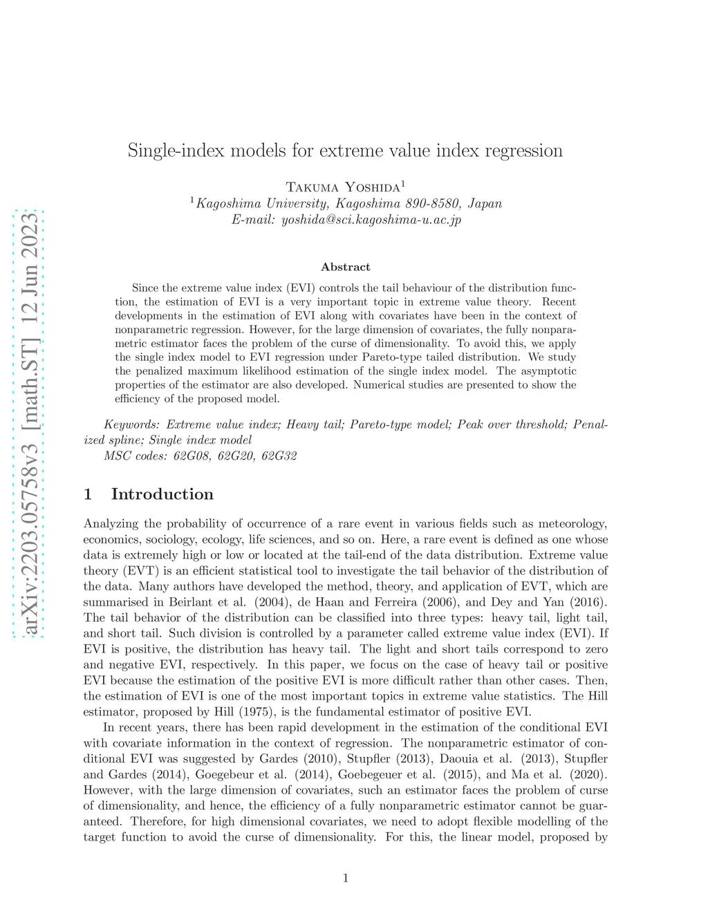 Since the extreme value index (EVI) controls the tail behaviour of the distribution function, the estimation of EVI is a very important topic in extreme value theory. Recent developments in the estimation of EVI along with covariates have been in the context of nonparametric regression. However, for the large dimension of covariates, the fully nonparametric estimator faces the problem of the curse of dimensionality. To avoid this, we apply the single index model to EVI regression under Pareto-type tailed distribution. We study the penalized maximum likelihood estimation of the single index model. The asymptotic properties of the estimator are also developed. Numerical studies are presented to show the efficiency of the proposed model.