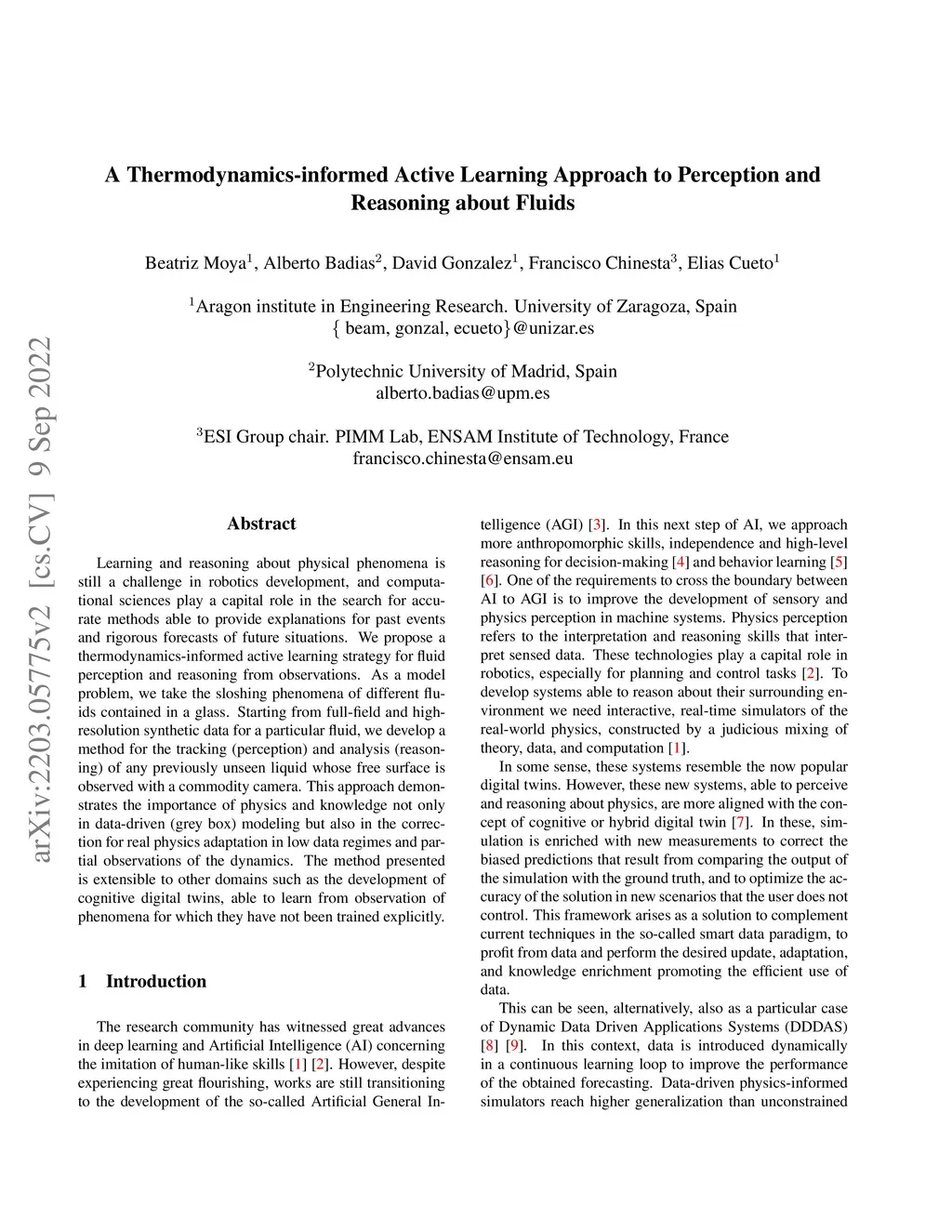 Learning and reasoning about physical phenomena is still a challenge in robotics development, and computational sciences play a capital role in the search for accurate methods able to provide explanations for past events and rigorous forecasts of future situations. We propose a thermodynamics-informed active learning strategy for fluid perception and reasoning from observations. As a model problem, we take the sloshing phenomena of different fluids contained in a glass. Starting from full-field and high-resolution synthetic data for a particular fluid, we develop a method for the tracking (perception) and analysis (reasoning) of any previously unseen liquid whose free surface is observed with a commodity camera. This approach demonstrates the importance of physics and knowledge not only in data-driven (grey box) modeling but also in the correction for real physics adaptation in low data regimes and partial observations of the dynamics. The method presented is extensible to other domains such as the development of cognitive digital twins, able to learn from observation of phenomena for which they have not been trained explicitly.