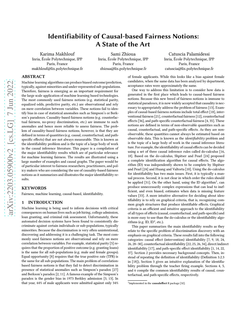 Machine learning algorithms can produce biased outcome/prediction, typically, against minorities and under-represented sub-populations. Therefore, fairness is emerging as an important requirement for the large scale application of machine learning based technologies. The most commonly used fairness notions (e.g. statistical parity, equalized odds, predictive parity, etc.) are observational and rely on mere correlation between variables. These notions fail to identify bias in case of statistical anomalies such as Simpson's or Berkson's paradoxes. Causality-based fairness notions (e.g. counterfactual fairness, no-proxy discrimination, etc.) are immune to such anomalies and hence more reliable to assess fairness. The problem of causality-based fairness notions, however, is that they are defined in terms of quantities (e.g. causal, counterfactual, and path-specific effects) that are not always measurable. This is known as the identifiability problem and is the topic of a large body of work in the causal inference literature. This paper is a compilation of the major identifiability results which are of particular relevance for machine learning fairness. The results are illustrated using a large number of examples and causal graphs. The paper would be of particular interest to fairness researchers, practitioners, and policy makers who are considering the use of causality-based fairness notions as it summarizes and illustrates the major identifiability results