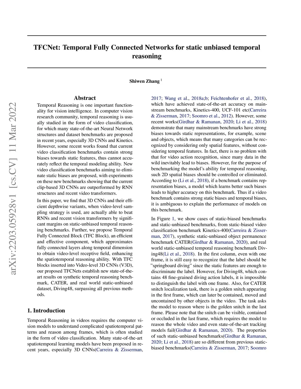 Temporal Reasoning is one important functionality for vision intelligence. In computer vision research community, temporal reasoning is usually studied in the form of video classification, for which many state-of-the-art Neural Network structures and dataset benchmarks are proposed in recent years, especially 3D CNNs and Kinetics. However, some recent works found that current video classification benchmarks contain strong biases towards static features, thus cannot accurately reflect the temporal modeling ability. New video classification benchmarks aiming to eliminate static biases are proposed, with experiments on these new benchmarks showing that the current clip-based 3D CNNs are outperformed by RNN structures and recent video transformers. In this paper, we find that 3D CNNs and their efficient depthwise variants, when video-level sampling strategy is used, are actually able to beat RNNs and recent vision transformers by significant margins on static-unbiased temporal reasoning benchmarks. Further, we propose Temporal Fully Connected Block (TFC Block), an efficient and effective component, which approximates fully connected layers along temporal dimension to obtain video-level receptive field, enhancing the spatiotemporal reasoning ability. With TFC blocks inserted into Video-level 3D CNNs (V3D), our proposed TFCNets establish new state-of-the-art results on synthetic temporal reasoning benchmark, CATER, and real world static-unbiased dataset, Diving48, surpassing all previous methods.