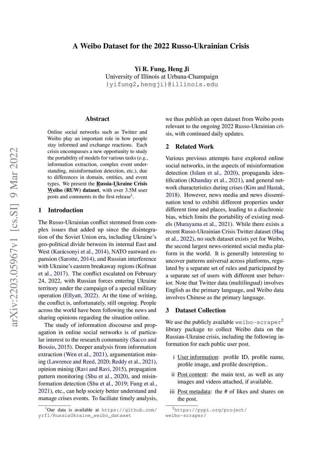 Online social networks such as Twitter and Weibo play an important role in how people stay informed and exchange reactions. Each crisis encompasses a new opportunity to study the portability of models for various tasks (e.g., information extraction, complex event understanding, misinformation detection, etc.), due to differences in domain, entities, and event types. We present the Russia-Ukraine Crisis Weibo (RUW) dataset, with over 3.5M user posts and comments in the first release. Our data is available at https://github.com/yrf1/RussiaUkraine_weibo_dataset.