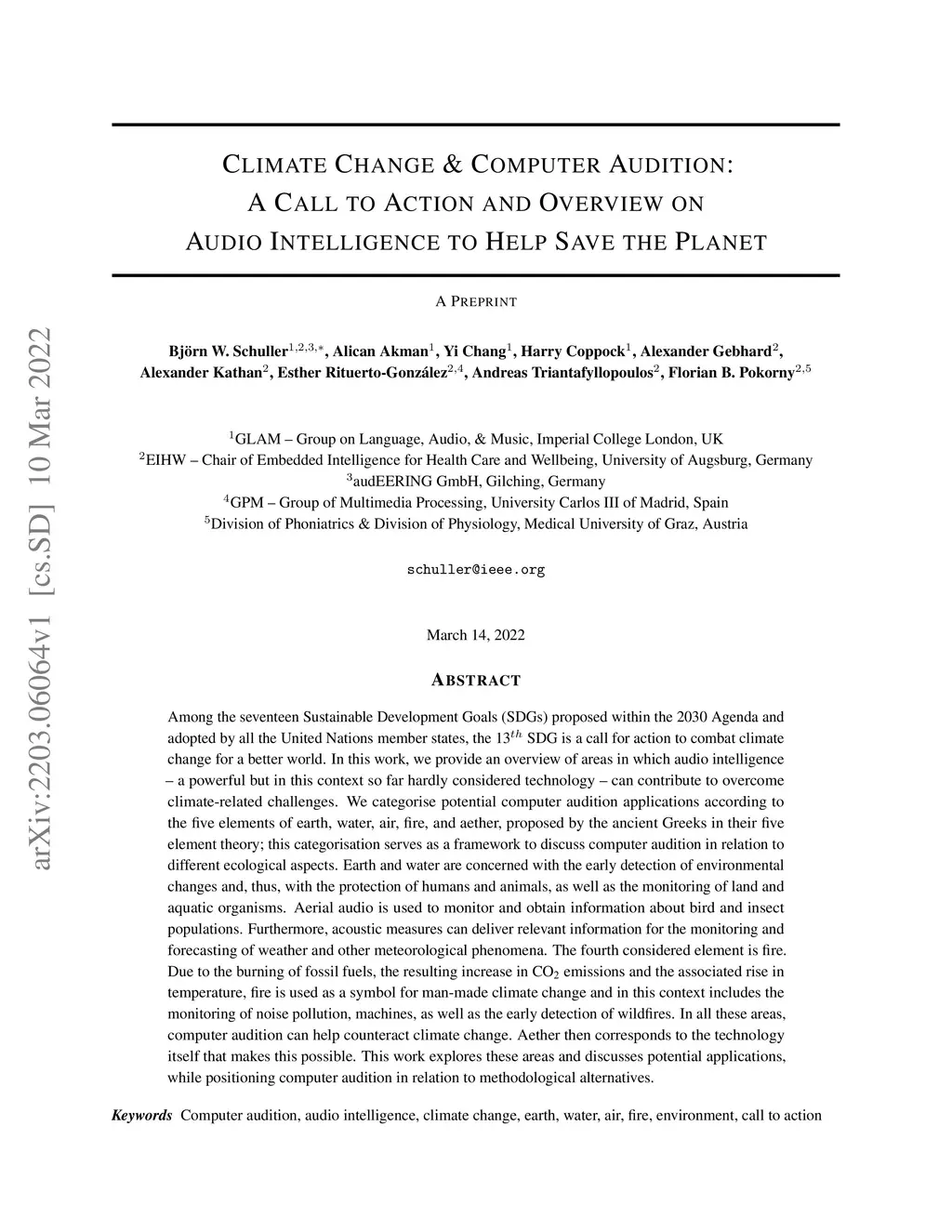 Among the seventeen Sustainable Development Goals (SDGs) proposed within the 2030 Agenda and adopted by all the United Nations member states, the 13 SDG is a call for action to combat climate change for a better world. In this work, we provide an overview of areas in which audio intelligence -- a powerful but in this context so far hardly considered technology -- can contribute to overcome climate-related challenges. We categorise potential computer audition applications according to the five elements of earth, water, air, fire, and aether, proposed by the ancient Greeks in their five element theory; this categorisation serves as a framework to discuss computer audition in relation to different ecological aspects. Earth and water are concerned with the early detection of environmental changes and, thus, with the protection of humans and animals, as well as the monitoring of land and aquatic organisms. Aerial audio is used to monitor and obtain information about bird and insect populations. Furthermore, acoustic measures can deliver relevant information for the monitoring and forecasting of weather and other meteorological phenomena. The fourth considered element is fire. Due to the burning of fossil fuels, the resulting increase in CO emissions and the associated rise in temperature, fire is used as a symbol for man-made climate change and in this context includes the monitoring of noise pollution, machines, as well as the early detection of wildfires. In all these areas, computer audition can help counteract climate change. Aether then corresponds to the technology itself that makes this possible. This work explores these areas and discusses potential applications, while positioning computer audition in relation to methodological alternatives.