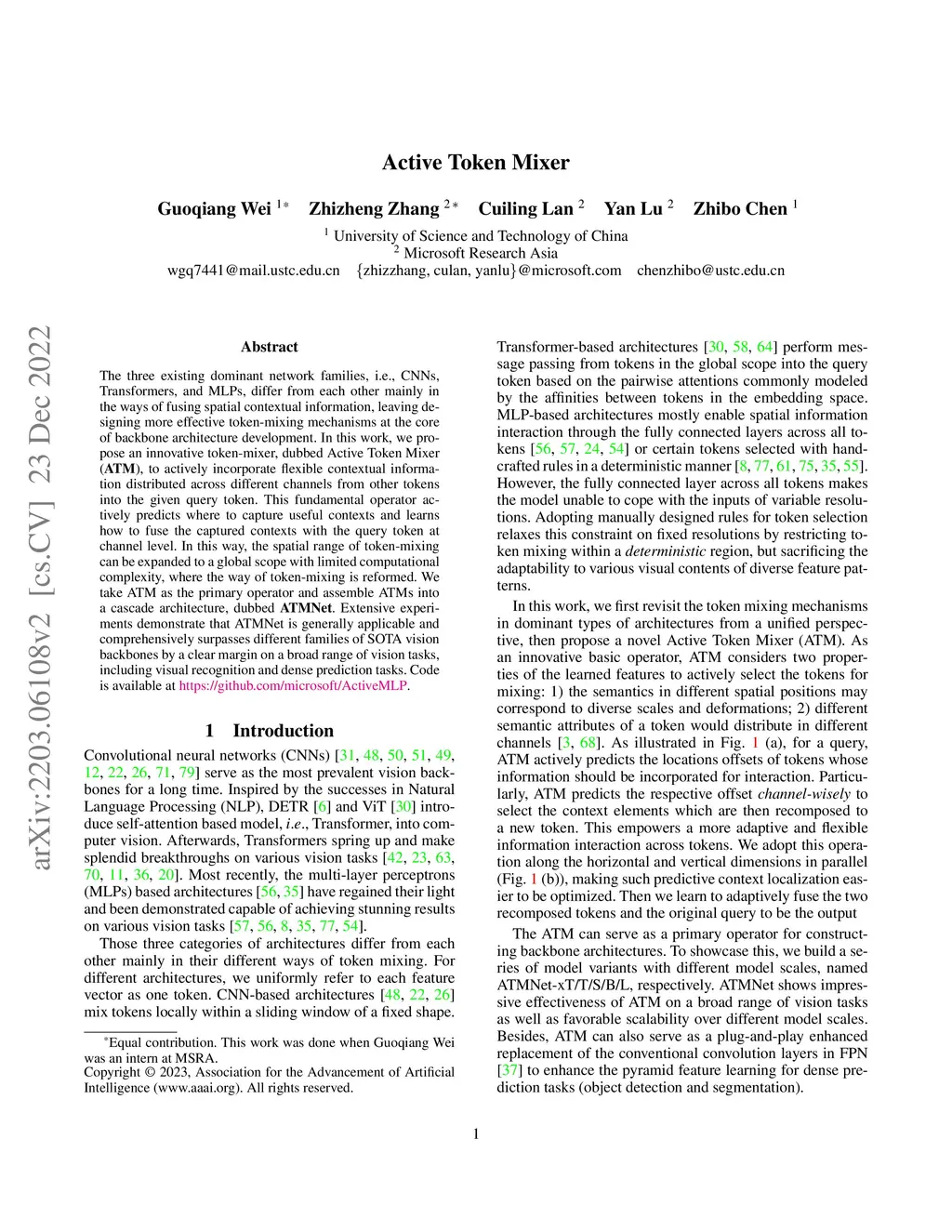 The three existing dominant network families, i.e., CNNs, Transformers, and MLPs, differ from each other mainly in the ways of fusing spatial contextual information, leaving designing more effective token-mixing mechanisms at the core of backbone architecture development. In this work, we propose an innovative token-mixer, dubbed Active Token Mixer (ATM), to actively incorporate flexible contextual information distributed across different channels from other tokens into the given query token. This fundamental operator actively predicts where to capture useful contexts and learns how to fuse the captured contexts with the query token at channel level. In this way, the spatial range of token-mixing can be expanded to a global scope with limited computational complexity, where the way of token-mixing is reformed. We take ATM as the primary operator and assemble ATMs into a cascade architecture, dubbed ATMNet. Extensive experiments demonstrate that ATMNet is generally applicable and comprehensively surpasses different families of SOTA vision backbones by a clear margin on a broad range of vision tasks, including visual recognition and dense prediction tasks. Code is available at https://github.com/microsoft/ActiveMLP.