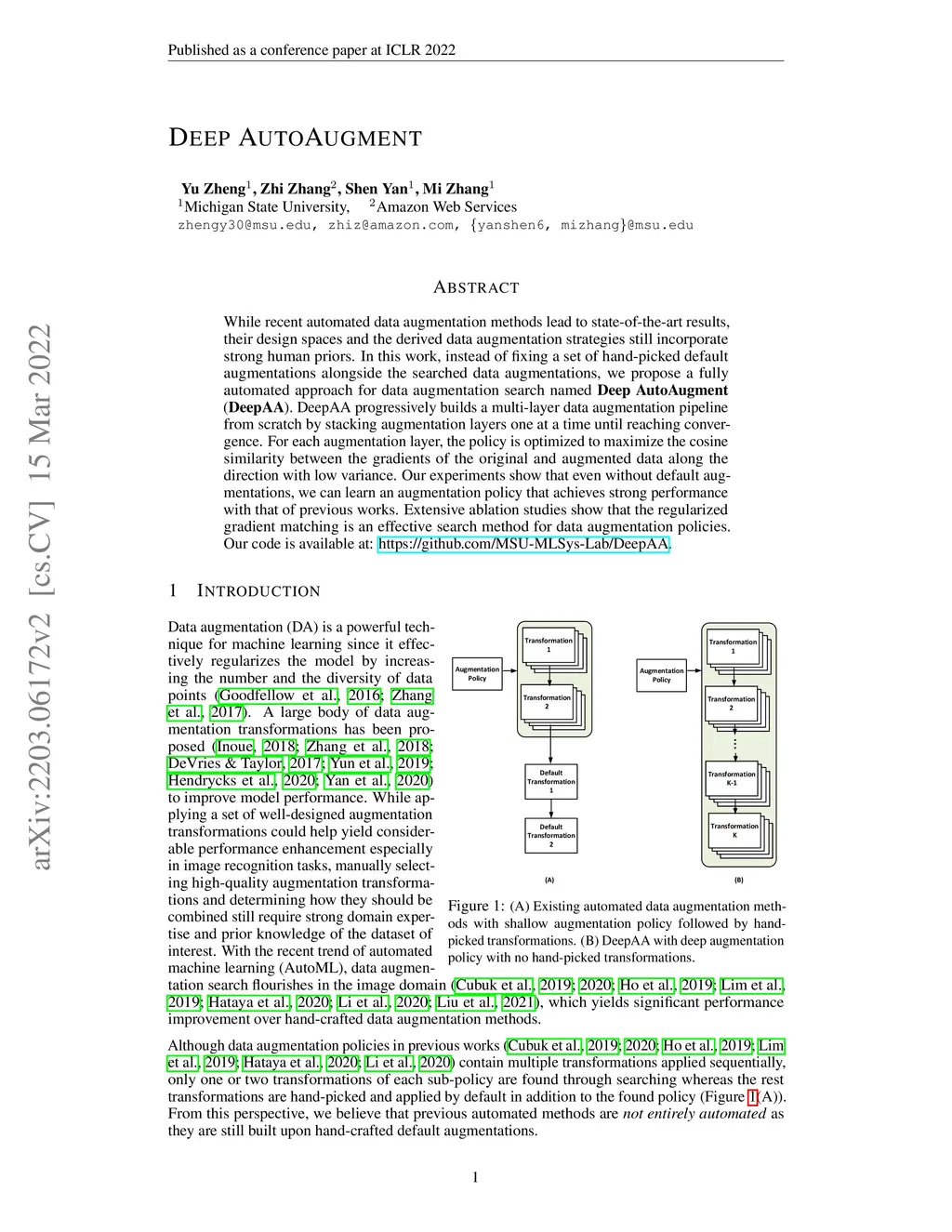 While recent automated data augmentation methods lead to state-of-the-art results, their design spaces and the derived data augmentation strategies still incorporate strong human priors. In this work, instead of fixing a set of hand-picked default augmentations alongside the searched data augmentations, we propose a fully automated approach for data augmentation search named Deep AutoAugment (DeepAA). DeepAA progressively builds a multi-layer data augmentation pipeline from scratch by stacking augmentation layers one at a time until reaching convergence. For each augmentation layer, the policy is optimized to maximize the cosine similarity between the gradients of the original and augmented data along the direction with low variance. Our experiments show that even without default augmentations, we can learn an augmentation policy that achieves strong performance with that of previous works. Extensive ablation studies show that the regularized gradient matching is an effective search method for data augmentation policies. Our code is available at: https://github.com/MSU-MLSys-Lab/DeepAA .