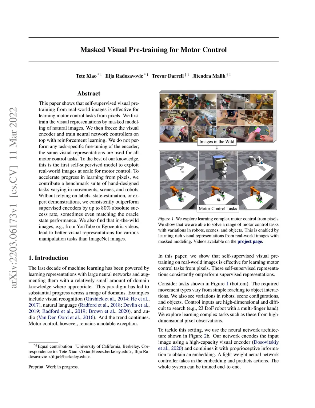 This paper shows that self-supervised visual pre-training from real-world images is effective for learning motor control tasks from pixels. We first train the visual representations by masked modeling of natural images. We then freeze the visual encoder and train neural network controllers on top with reinforcement learning. We do not perform any task-specific fine-tuning of the encoder; the same visual representations are used for all motor control tasks. To the best of our knowledge, this is the first self-supervised model to exploit real-world images at scale for motor control. To accelerate progress in learning from pixels, we contribute a benchmark suite of hand-designed tasks varying in movements, scenes, and robots. Without relying on labels, state-estimation, or expert demonstrations, we consistently outperform supervised encoders by up to 80% absolute success rate, sometimes even matching the oracle state performance. We also find that in-the-wild images, e.g., from YouTube or Egocentric videos, lead to better visual representations for various manipulation tasks than ImageNet images.