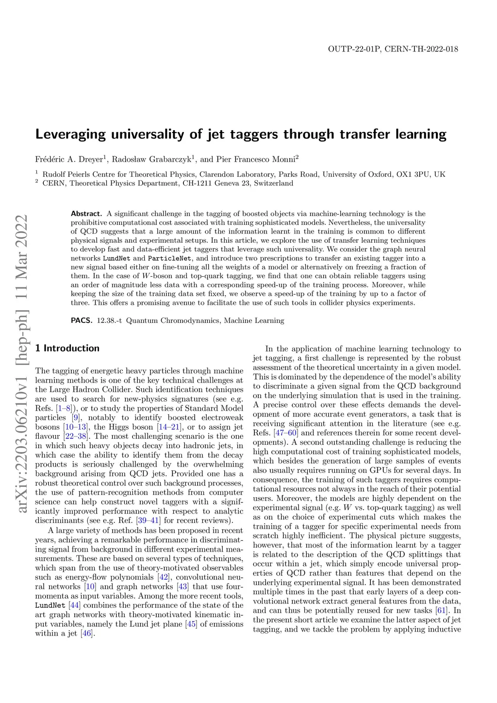 A significant challenge in the tagging of boosted objects via machine-learning technology is the prohibitive computational cost associated with training sophisticated models. Nevertheless, the universality of QCD suggests that a large amount of the information learnt in the training is common to different physical signals and experimental setups. In this article, we explore the use of transfer learning techniques to develop fast and data-efficient jet taggers that leverage such universality. We consider the graph neural networks LundNet and ParticleNet, and introduce two prescriptions to transfer an existing tagger into a new signal based either on fine-tuning all the weights of a model or alternatively on freezing a fraction of them. In the case of -boson and top-quark tagging, we find that one can obtain reliable taggers using an order of magnitude less data with a corresponding speed-up of the training process. Moreover, while keeping the size of the training data set fixed, we observe a speed-up of the training by up to a factor of three. This offers a promising avenue to facilitate the use of such tools in collider physics experiments.