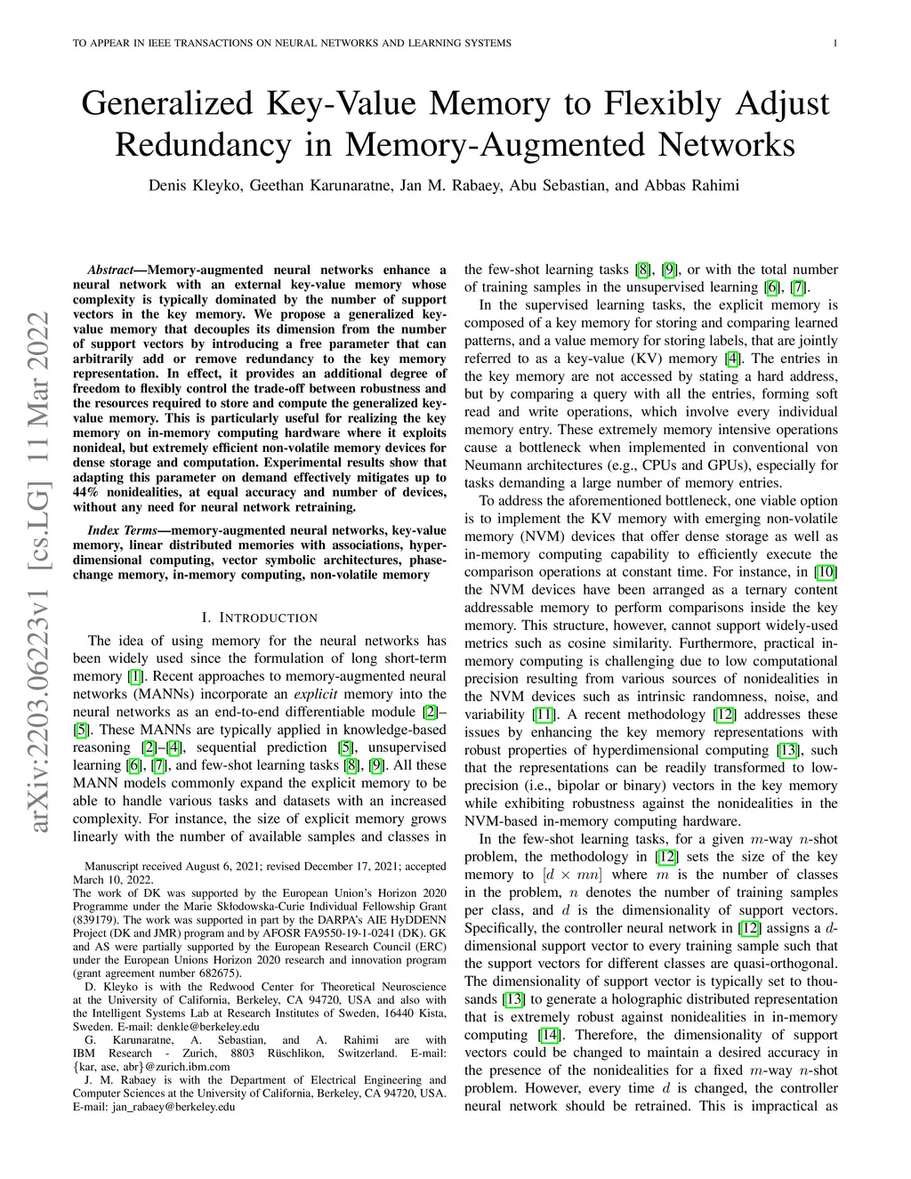 Memory-augmented neural networks enhance a neural network with an external key-value memory whose complexity is typically dominated by the number of support vectors in the key memory. We propose a generalized key-value memory that decouples its dimension from the number of support vectors by introducing a free parameter that can arbitrarily add or remove redundancy to the key memory representation. In effect, it provides an additional degree of freedom to flexibly control the trade-off between robustness and the resources required to store and compute the generalized key-value memory. This is particularly useful for realizing the key memory on in-memory computing hardware where it exploits nonideal, but extremely efficient non-volatile memory devices for dense storage and computation. Experimental results show that adapting this parameter on demand effectively mitigates up to 44% nonidealities, at equal accuracy and number of devices, without any need for neural network retraining.