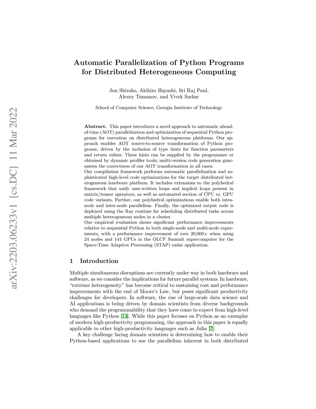 This paper introduces a novel approach to automatic ahead-of-time (AOT) parallelization and optimization of sequential Python programs for execution on distributed heterogeneous platforms. Our approach enables AOT source-to-source transformation of Python programs, driven by the inclusion of type hints for function parameters and return values. These hints can be supplied by the programmer or obtained by dynamic profiler tools; multi-version code generation guarantees the correctness of our AOT transformation in all cases. Our compilation framework performs automatic parallelization and sophisticated high-level code optimizations for the target distributed heterogeneous hardware platform. It includes extensions to the polyhedral framework that unify user-written loops and implicit loops present in matrix/tensor operators, as well as automated section of CPU vs. GPU code variants. Further, our polyhedral optimizations enable both intra-node and inter-node parallelism. Finally, the optimized output code is deployed using the Ray runtime for scheduling distributed tasks across multiple heterogeneous nodes in a cluster. Our empirical evaluation shows significant performance improvements relative to sequential Python in both single-node and multi-node experiments, with a performance improvement of over 20,000 when using 24 nodes and 144 GPUs in the OLCF Summit supercomputer for the Space-Time Adaptive Processing (STAP) radar application.