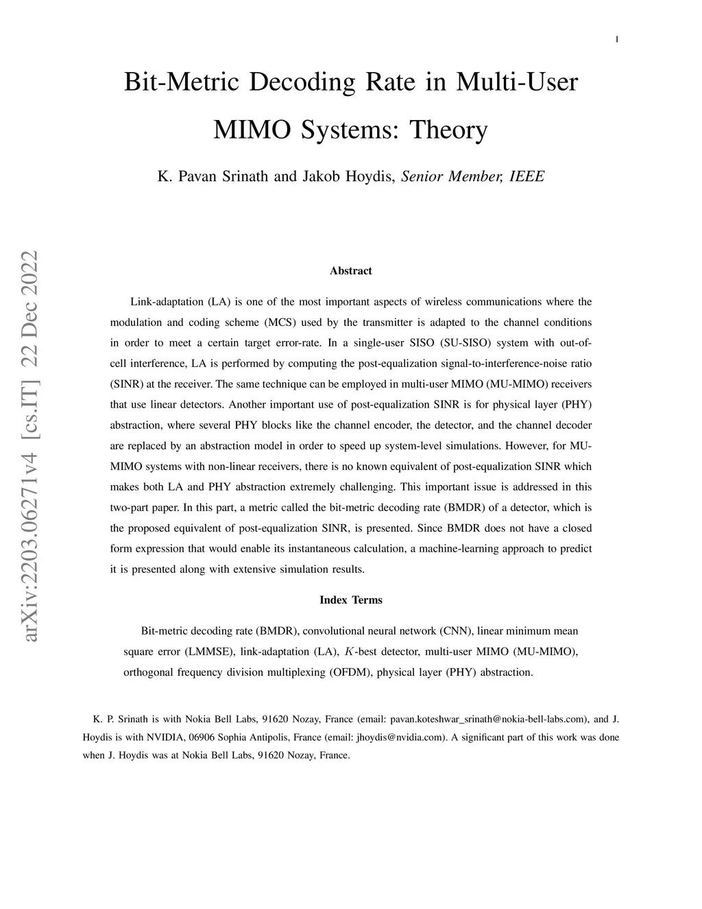 Link-adaptation (LA) is one of the most important aspects of wireless communications where the modulation and coding scheme (MCS) used by the transmitter is adapted to the channel conditions in order to meet a certain target error-rate. In a single-user SISO (SU-SISO) system with out-of-cell interference, LA is performed by computing the post-equalization signal-to-interference-noise ratio (SINR) at the receiver. The same technique can be employed in multi-user MIMO (MU-MIMO) receivers that use linear detectors. Another important use of post-equalization SINR is for physical layer (PHY) abstraction, where several PHY blocks like the channel encoder, the detector, and the channel decoder are replaced by an abstraction model in order to speed up system-level simulations. However, for MU-MIMO systems with non-linear receivers, there is no known equivalent of post-equalization SINR which makes both LA and PHY abstraction extremely challenging. This important issue is addressed in this two-part paper. In this part, a metric called the bit-metric decoding rate (BMDR) of a detector, which is the proposed equivalent of post-equalization SINR, is presented. Since BMDR does not have a closed form expression that would enable its instantaneous calculation, a machine-learning approach to predict it is presented along with extensive simulation results.