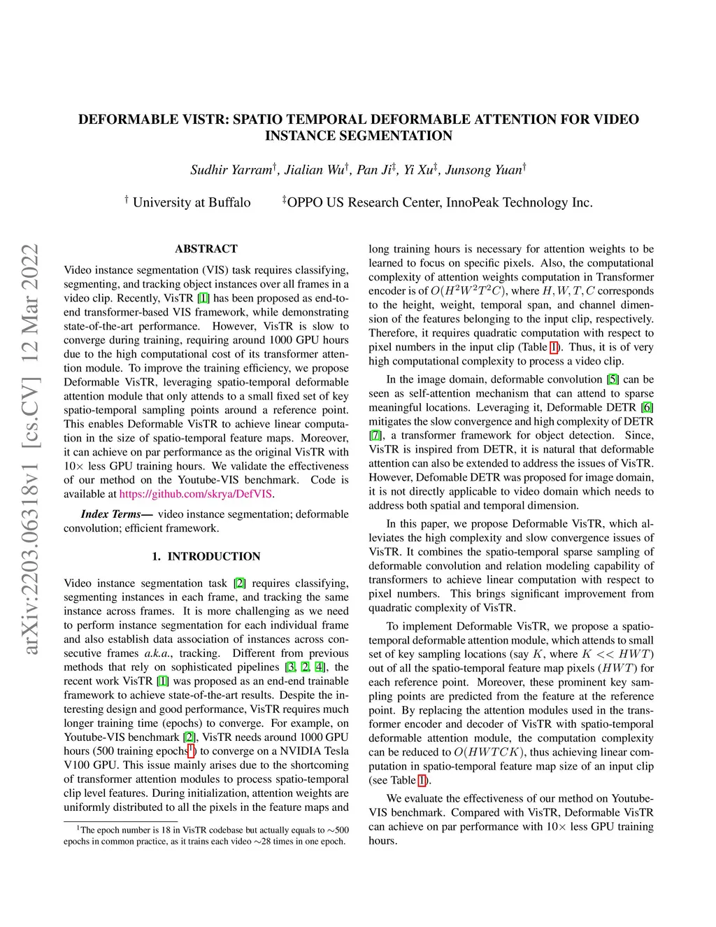 Video instance segmentation (VIS) task requires classifying, segmenting, and tracking object instances over all frames in a video clip. Recently, VisTR has been proposed as end-to-end transformer-based VIS framework, while demonstrating state-of-the-art performance. However, VisTR is slow to converge during training, requiring around 1000 GPU hours due to the high computational cost of its transformer attention module. To improve the training efficiency, we propose Deformable VisTR, leveraging spatio-temporal deformable attention module that only attends to a small fixed set of key spatio-temporal sampling points around a reference point. This enables Deformable VisTR to achieve linear computation in the size of spatio-temporal feature maps. Moreover, it can achieve on par performance as the original VisTR with 10 less GPU training hours. We validate the effectiveness of our method on the Youtube-VIS benchmark. Code is available at https://github.com/skrya/DefVIS.