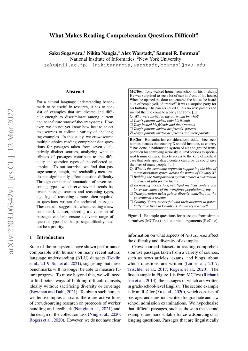 For a natural language understanding benchmark to be useful in research, it has to consist of examples that are diverse and difficult enough to discriminate among current and near-future state-of-the-art systems. However, we do not yet know how best to select text sources to collect a variety of challenging examples. In this study, we crowdsource multiple-choice reading comprehension questions for passages taken from seven qualitatively distinct sources, analyzing what attributes of passages contribute to the difficulty and question types of the collected examples. To our surprise, we find that passage source, length, and readability measures do not significantly affect question difficulty. Through our manual annotation of seven reasoning types, we observe several trends between passage sources and reasoning types, e.g., logical reasoning is more often required in questions written for technical passages. These results suggest that when creating a new benchmark dataset, selecting a diverse set of passages can help ensure a diverse range of question types, but that passage difficulty need not be a priority.