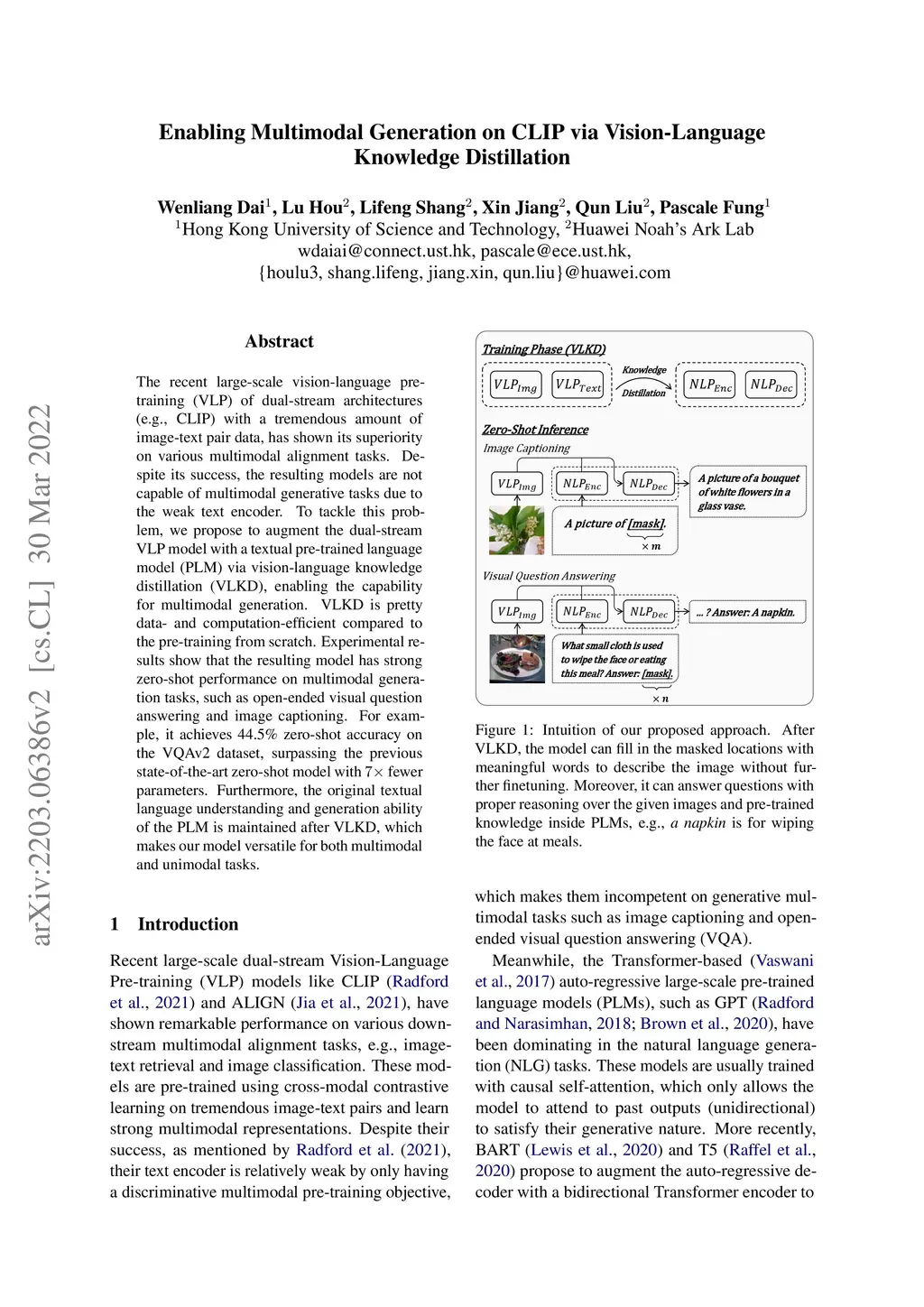 The recent large-scale vision-language pre-training (VLP) of dual-stream architectures (e.g., CLIP) with a tremendous amount of image-text pair data, has shown its superiority on various multimodal alignment tasks. Despite its success, the resulting models are not capable of multimodal generative tasks due to the weak text encoder. To tackle this problem, we propose to augment the dual-stream VLP model with a textual pre-trained language model (PLM) via vision-language knowledge distillation (VLKD), enabling the capability for multimodal generation. VLKD is pretty data- and computation-efficient compared to the pre-training from scratch. Experimental results show that the resulting model has strong zero-shot performance on multimodal generation tasks, such as open-ended visual question answering and image captioning. For example, it achieves 44.5% zero-shot accuracy on the VQAv2 dataset, surpassing the previous state-of-the-art zero-shot model with 7×7\times fewer parameters. Furthermore, the original textual language understanding and generation ability of the PLM is maintained after VLKD, which makes our model versatile for both multimodal and unimodal tasks.