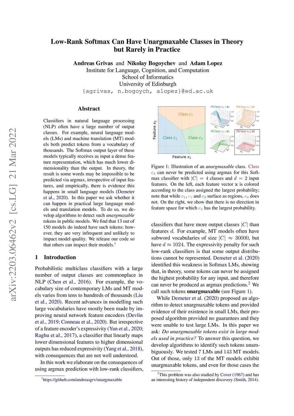 Classifiers in natural language processing (NLP) often have a large number of output classes. For example, neural language models (LMs) and machine translation (MT) models both predict tokens from a vocabulary of thousands. The Softmax output layer of these models typically receives as input a dense feature representation, which has much lower dimensionality than the output. In theory, the result is some words may be impossible to be predicted via argmax, irrespective of input features, and empirically, there is evidence this happens in small language models. In this paper we ask whether it can happen in practical large language models and translation models. To do so, we develop algorithms to detect such \emph{unargmaxable} tokens in public models. We find that 13 out of 150 models do indeed have such tokens; however, they are very infrequent and unlikely to impact model quality. We release our code so that others can inspect their models.