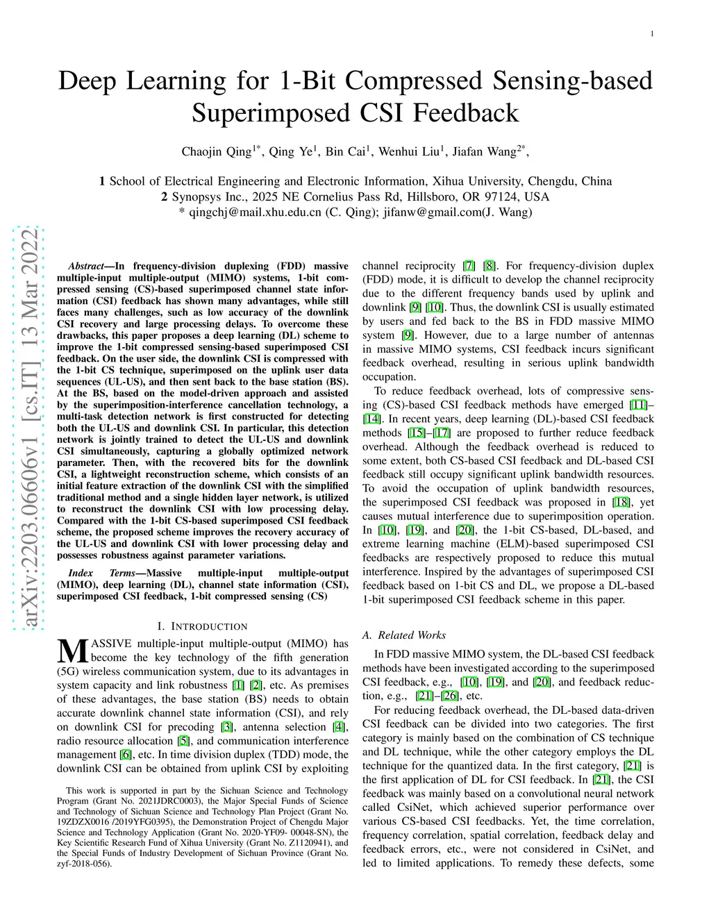 In frequency-division duplexing (FDD) massive multiple-input multiple-output (MIMO) systems, 1-bit compressed sensing (CS)-based superimposed channel state information (CSI) feedback has shown many advantages, while still faces many challenges, such as low accuracy of the downlink CSI recovery and large processing delays. To overcome these drawbacks, this paper proposes a deep learning (DL) scheme to improve the 1-bit compressed sensing-based superimposed CSI feedback. On the user side, the downlink CSI is compressed with the 1-bit CS technique, superimposed on the uplink user data sequences (UL-US), and then sent back to the base station (BS). At the BS, based on the model-driven approach and assisted by the superimposition-interference cancellation technology, a multi-task detection network is first constructed for detecting both the UL-US and downlink CSI. In particular, this detection network is jointly trained to detect the UL-US and downlink CSI simultaneously, capturing a globally optimized network parameter. Then, with the recovered bits for the downlink CSI, a lightweight reconstruction scheme, which consists of an initial feature extraction of the downlink CSI with the simplified traditional method and a single hidden layer network, is utilized to reconstruct the downlink CSI with low processing delay. Compared with the 1-bit CS-based superimposed CSI feedback scheme, the proposed scheme improves the recovery accuracy of the UL-US and downlink CSI with lower processing delay and possesses robustness against parameter variations.