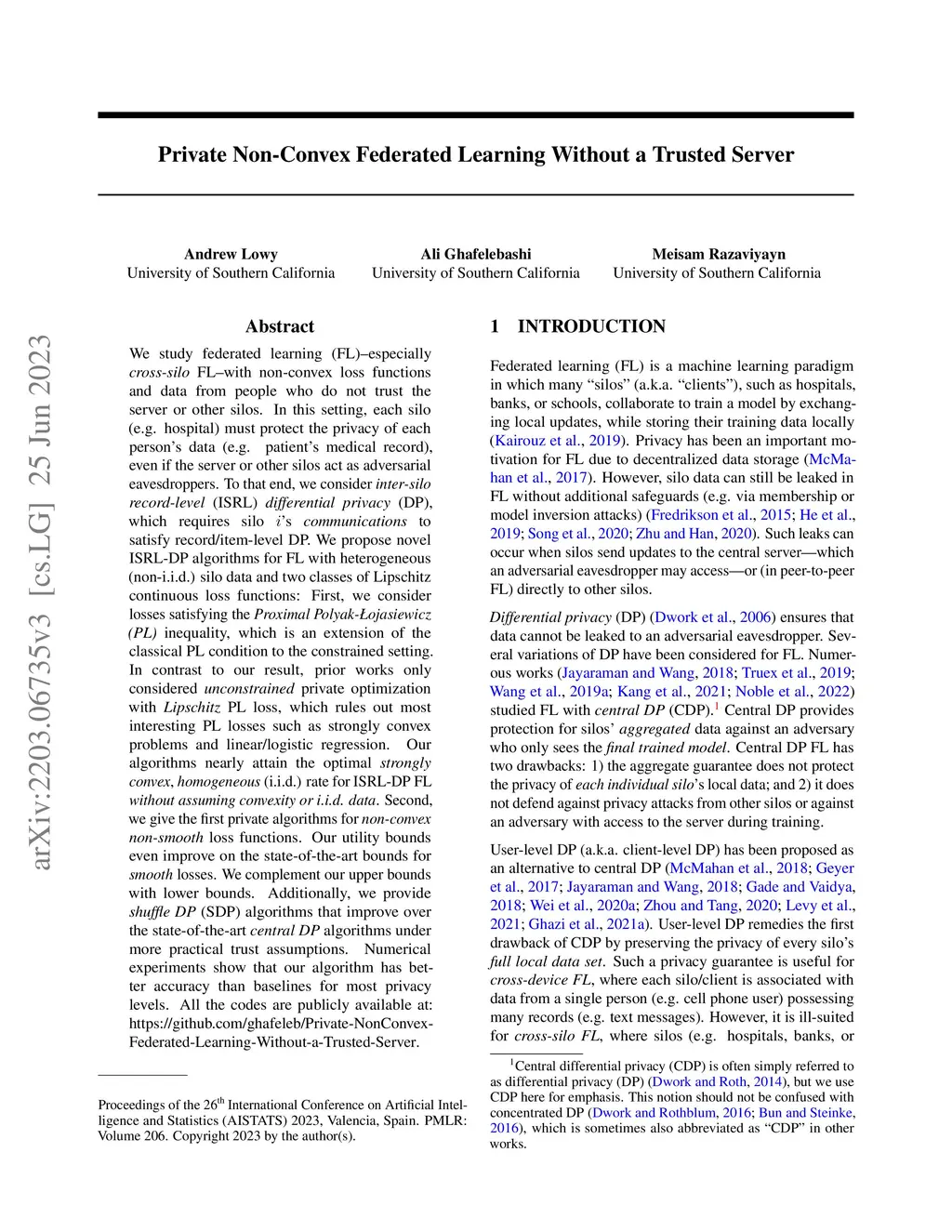 We study federated learning (FL) -- especially cross-silo FL -- with non-convex loss functions and data from people who do not trust the server or other silos. In this setting, each silo (e.g. hospital) must protect the privacy of each person's data (e.g. patient's medical record), even if the server or other silos act as adversarial eavesdroppers. To that end, we consider inter-silo record-level (ISRL) differential privacy (DP), which requires silo~'s communications to satisfy record/item-level DP. We propose novel ISRL-DP algorithms for FL with heterogeneous (non-i.i.d.) silo data and two classes of Lipschitz continuous loss functions: First, we consider losses satisfying the Proximal Polyak-Lojasiewicz (PL) inequality, which is an extension of the classical PL condition to the constrained setting. In contrast to our result, prior works only considered unconstrained private optimization with Lipschitz PL loss, which rules out most interesting PL losses such as strongly convex problems and linear/logistic regression. Our algorithms nearly attain the optimal strongly convex, homogeneous (i.i.d.) rate for ISRL-DP FL without assuming convexity or i.i.d. data. Second, we give the first private algorithms for non-convex non-smooth loss functions. Our utility bounds even improve on the state-of-the-art bounds for smooth losses. We complement our upper bounds with lower bounds. Additionally, we provide shuffle DP (SDP) algorithms that improve over the state-of-the-art central DP algorithms under more practical trust assumptions. Numerical experiments show that our algorithm has better accuracy than baselines for most privacy levels. All the codes are publicly available at: https://github.com/ghafeleb/Private-NonConvex-Federated-Learning-Without-a-Trusted-Server.