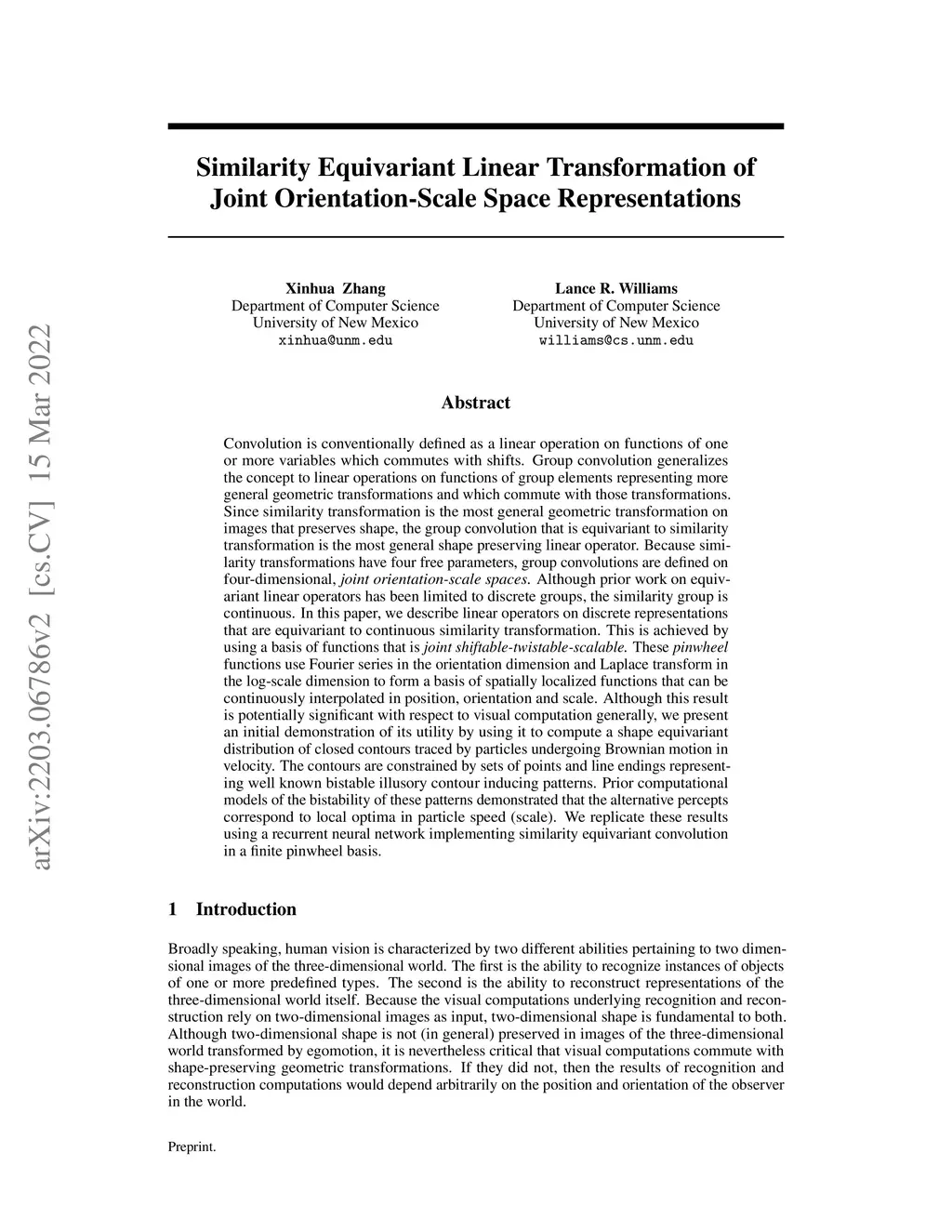 Convolution is conventionally defined as a linear operation on functions of one or more variables which commutes with shifts. Group convolution generalizes the concept to linear operations on functions of group elements representing more general geometric transformations and which commute with those transformations. Since similarity transformation is the most general geometric transformation on images that preserves shape, the group convolution that is equivariant to similarity transformation is the most general shape preserving linear operator. Because similarity transformations have four free parameters, group convolutions are defined on four-dimensional, joint orientation-scale spaces. Although prior work on equivariant linear operators has been limited to discrete groups, the similarity group is continuous. In this paper, we describe linear operators on discrete representations that are equivariant to continuous similarity transformation. This is achieved by using a basis of functions that is it joint shiftable-twistable-scalable. These pinwheel functions use Fourier series in the orientation dimension and Laplace transform in the log-scale dimension to form a basis of spatially localized functions that can be continuously interpolated in position, orientation and scale. Although this result is potentially significant with respect to visual computation generally, we present an initial demonstration of its utility by using it to compute a shape equivariant distribution of closed contours traced by particles undergoing Brownian motion in velocity. The contours are constrained by sets of points and line endings representing well known bistable illusory contour inducing patterns.