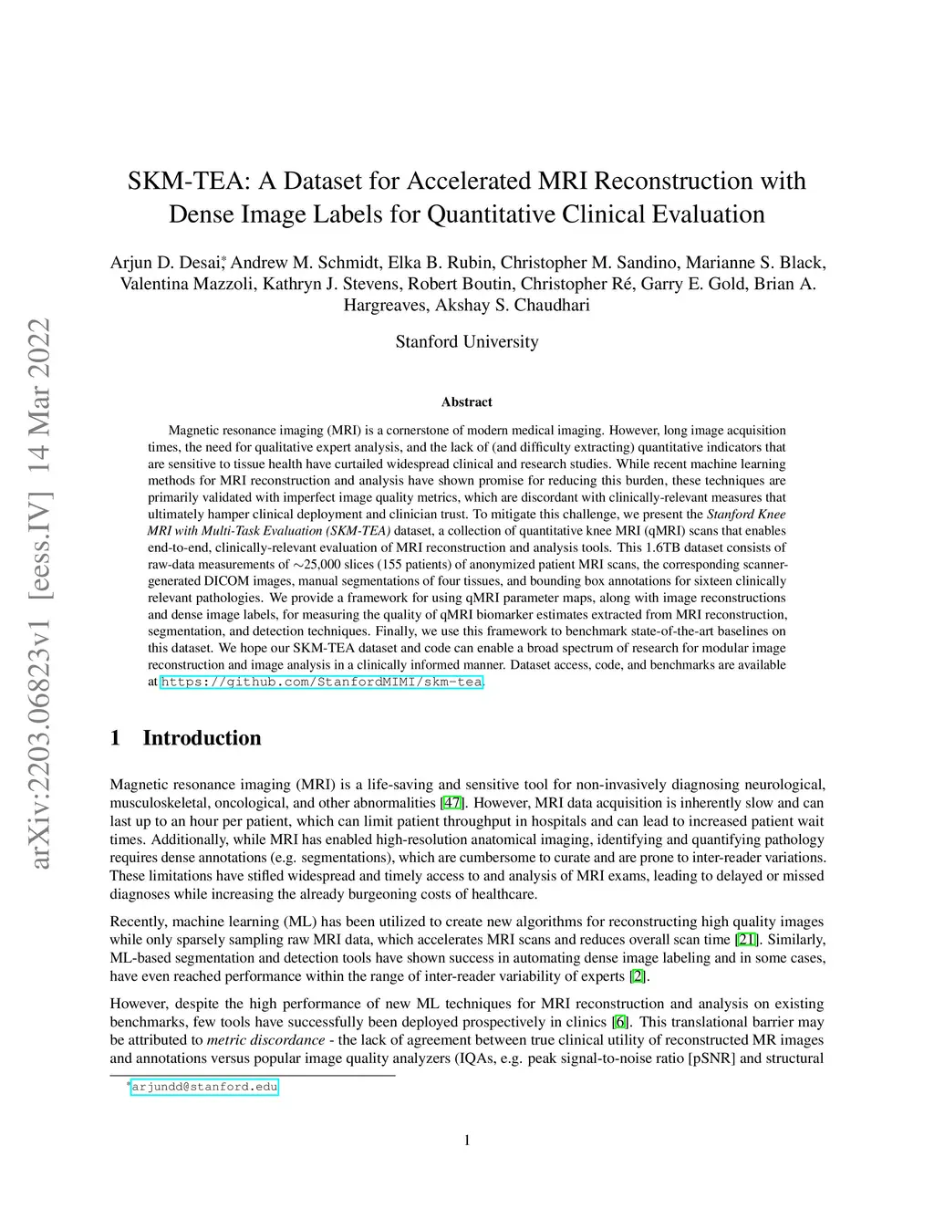 Magnetic resonance imaging (MRI) is a cornerstone of modern medical imaging. However, long image acquisition times, the need for qualitative expert analysis, and the lack of (and difficulty extracting) quantitative indicators that are sensitive to tissue health have curtailed widespread clinical and research studies. While recent machine learning methods for MRI reconstruction and analysis have shown promise for reducing this burden, these techniques are primarily validated with imperfect image quality metrics, which are discordant with clinically-relevant measures that ultimately hamper clinical deployment and clinician trust. To mitigate this challenge, we present the Stanford Knee MRI with Multi-Task Evaluation (SKM-TEA) dataset, a collection of quantitative knee MRI (qMRI) scans that enables end-to-end, clinically-relevant evaluation of MRI reconstruction and analysis tools. This 1.6TB dataset consists of raw-data measurements of ~25,000 slices (155 patients) of anonymized patient MRI scans, the corresponding scanner-generated DICOM images, manual segmentations of four tissues, and bounding box annotations for sixteen clinically relevant pathologies. We provide a framework for using qMRI parameter maps, along with image reconstructions and dense image labels, for measuring the quality of qMRI biomarker estimates extracted from MRI reconstruction, segmentation, and detection techniques. Finally, we use this framework to benchmark state-of-the-art baselines on this dataset. We hope our SKM-TEA dataset and code can enable a broad spectrum of research for modular image reconstruction and image analysis in a clinically informed manner. Dataset access, code, and benchmarks are available at https://github.com/StanfordMIMI/skm-tea.