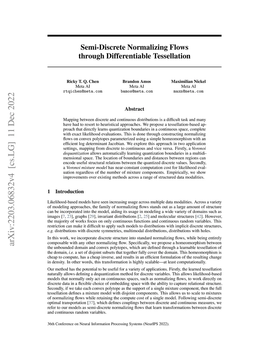Mapping between discrete and continuous distributions is a difficult task and many have had to resort to heuristical approaches. We propose a tessellation-based approach that directly learns quantization boundaries in a continuous space, complete with exact likelihood evaluations. This is done through constructing normalizing flows on convex polytopes parameterized using a simple homeomorphism with an efficient log determinant Jacobian. We explore this approach in two application settings, mapping from discrete to continuous and vice versa. Firstly, a Voronoi dequantization allows automatically learning quantization boundaries in a multidimensional space. The location of boundaries and distances between regions can encode useful structural relations between the quantized discrete values. Secondly, a Voronoi mixture model has near-constant computation cost for likelihood evaluation regardless of the number of mixture components. Empirically, we show improvements over existing methods across a range of structured data modalities.